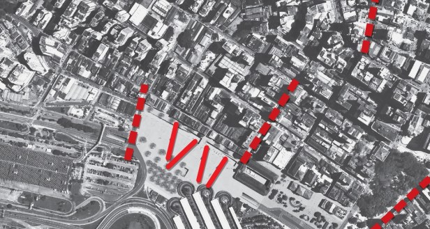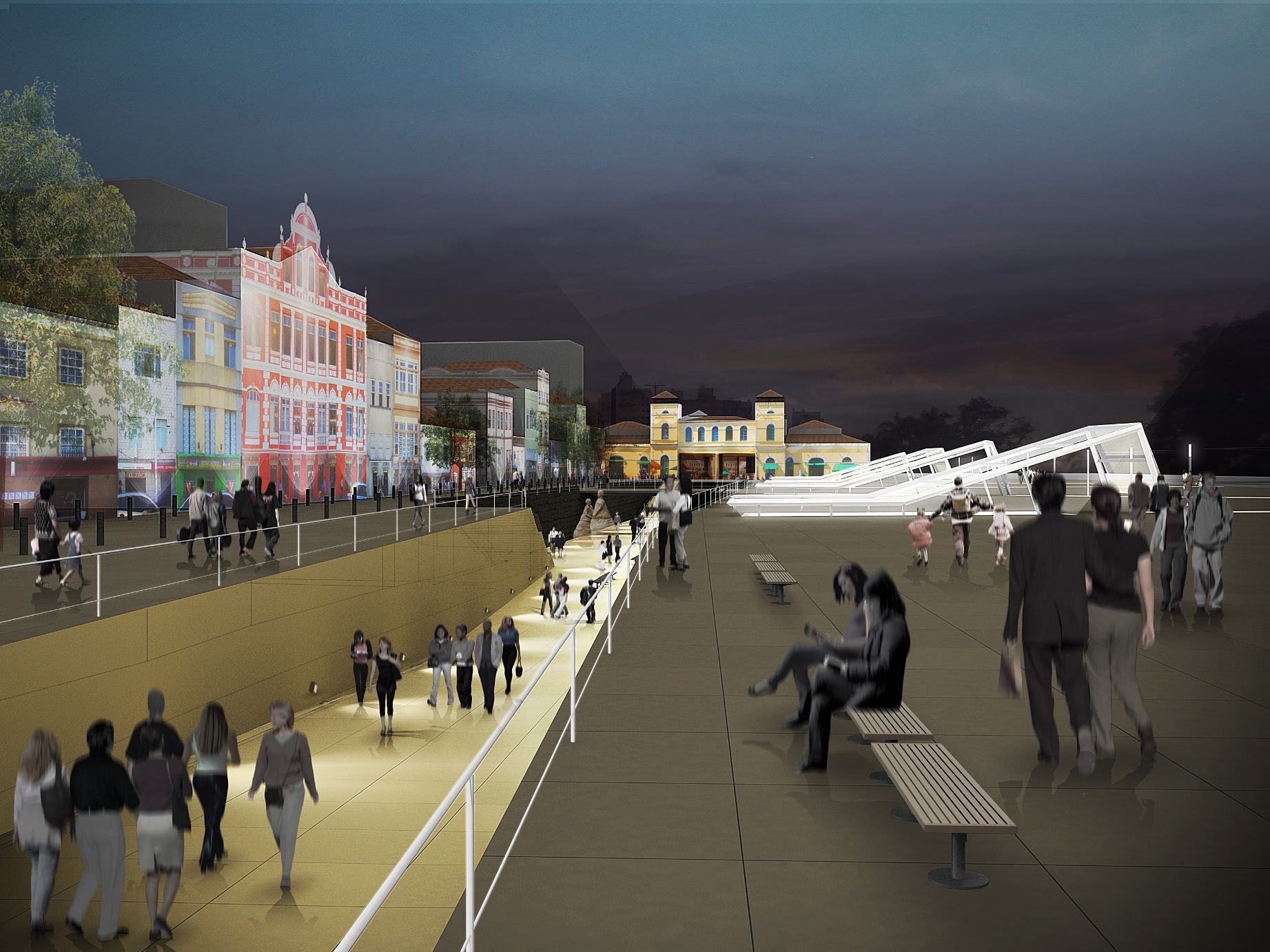 Abrem-se, desde a nova praça, frestas de acesso ao plano inferior, com declinações transferidas dos diferentes traçados da malha urbana consolidada do entorno. Estes acessos se identificam à noite como “faróis” – uma “carga cultural” ponderada e contemporânea no marco histórico do lugar.