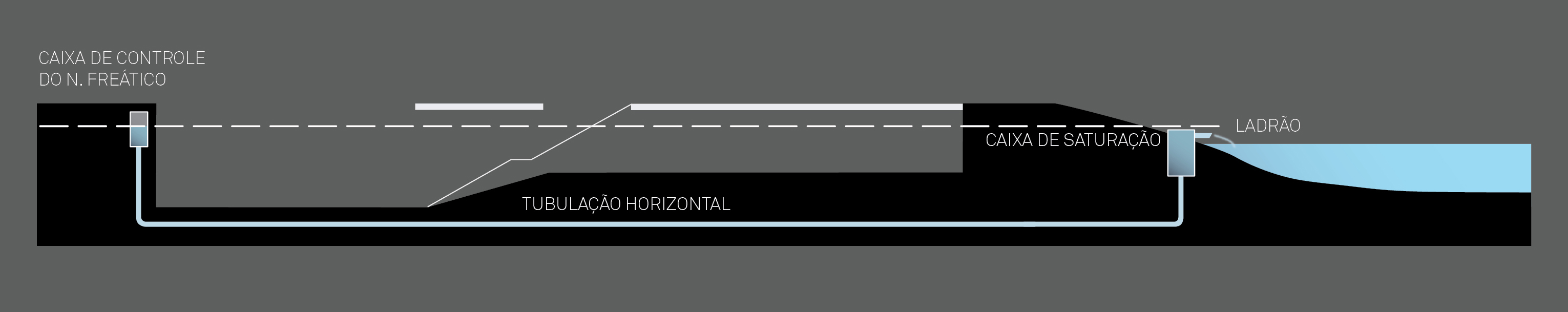 Controle do nível do lençol freático sem rebaixamento do mesmo (para não afetar as construções históricas) através de sistema de ação sinfônica de pressão induzida pela gravidade (sem uso de bombas e sem necessidade de caimentos nas tubulações)