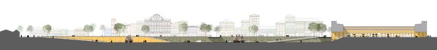 O plano rebaixado se configura como uma duplicação do solo urbano, que se desdobra tangencialmente nos pontos de conexão em franca continuidade.