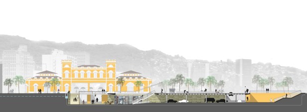 A estratégia desta intervenção foi concebida como uma fresta escavada no solo, de geometria simétrica à praça interna do mercado, configurando-se como uma extensão natural da mesma. Desta forma não se cria uma outra arquitetura, independente, a ser acrescida ao conjunto. O novo espaço não existe como volume sólido, é um espaço que se caracteriza como um grande hall urbano rebaixado, integrando todo o conjunto através de interfaces de acessos de escala metropolitana.