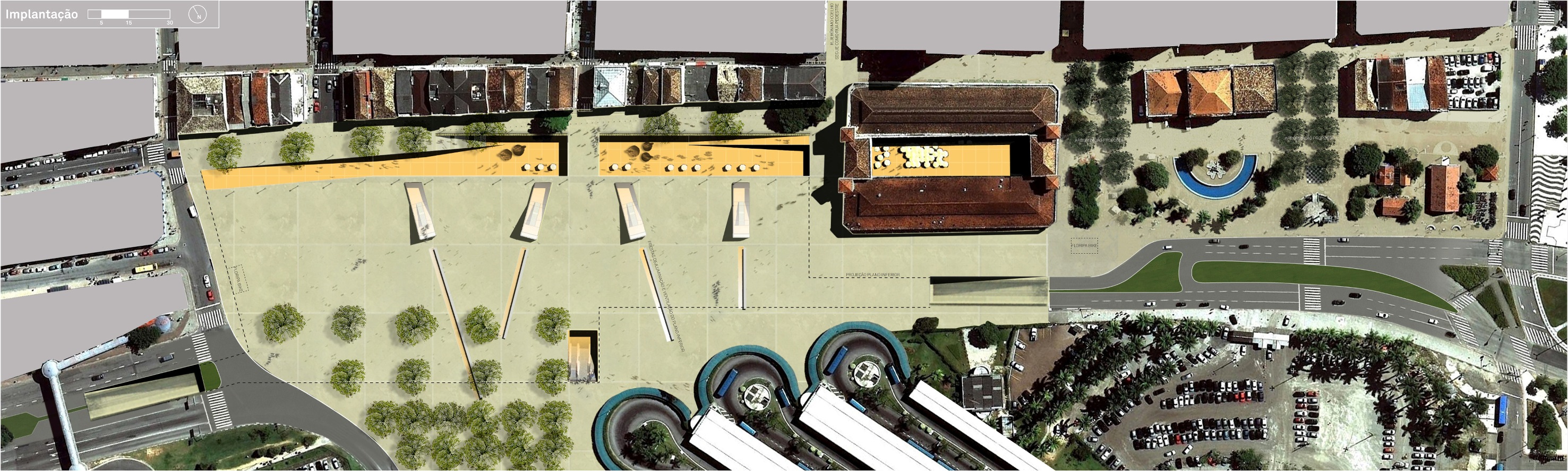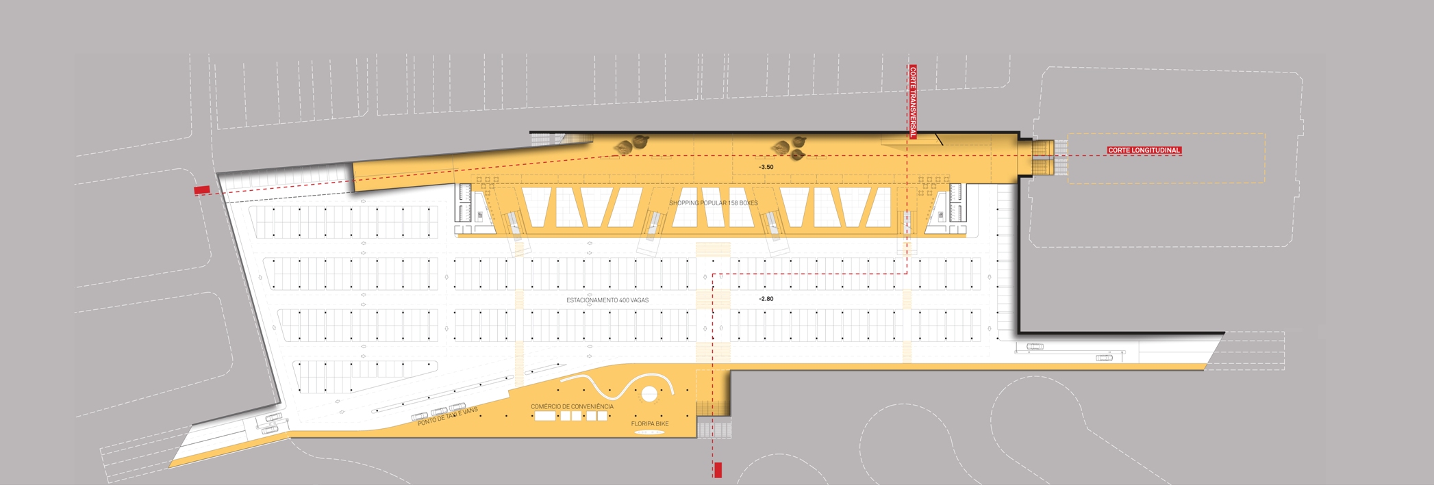 Modificamos o traçado viário para uma geometria menos “rodoviarista” e mais adequada à proposta do plano urbano rebaixado, que funciona, além de estacionamento de veículos, como: acesso às lojas de conveniência e ao mercado; local de concentração dos serviços de táxi, vans de turismo, bicicletário; áreas de serviços das lojas, sanitários, depósitos e áreas técnicas.