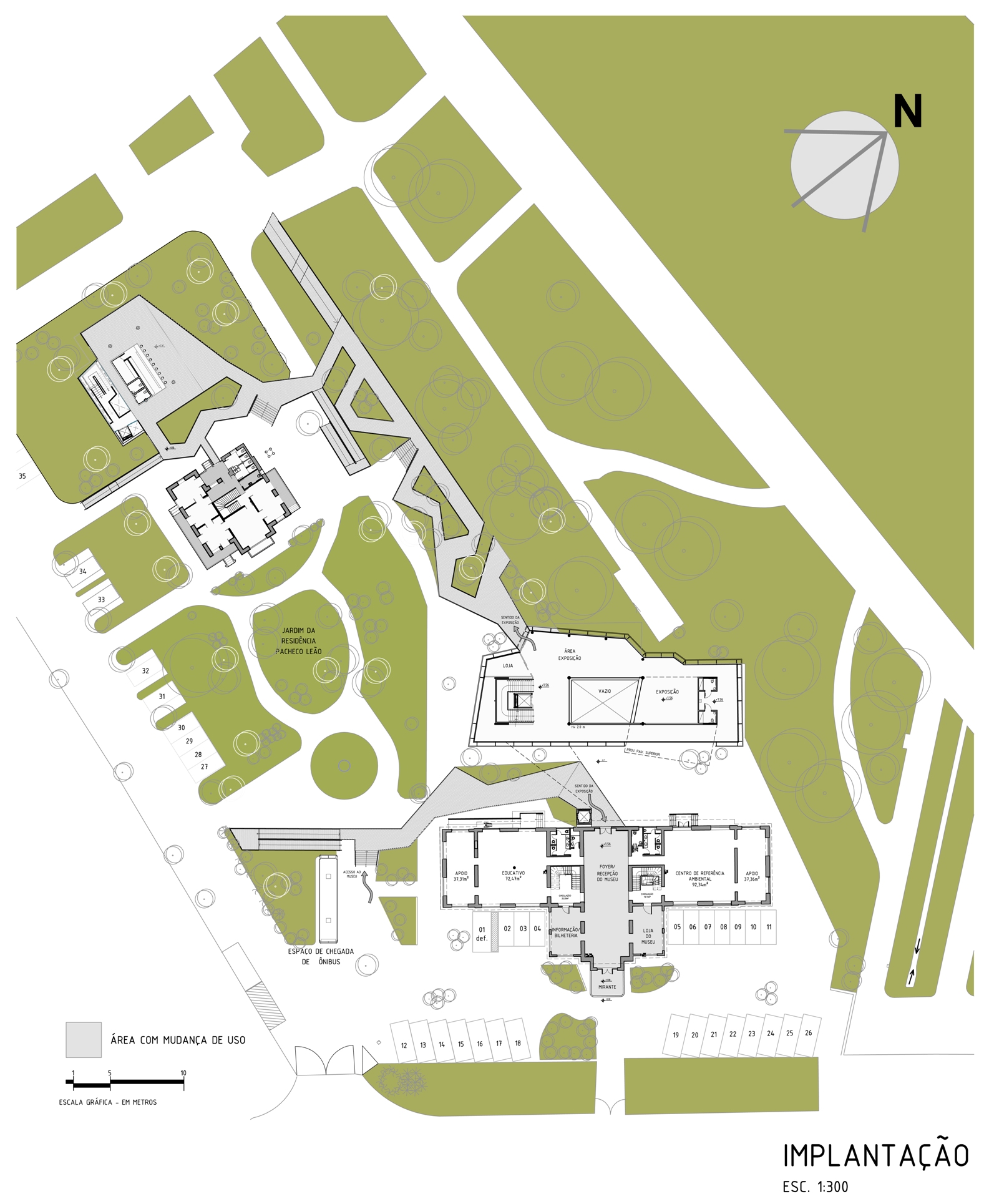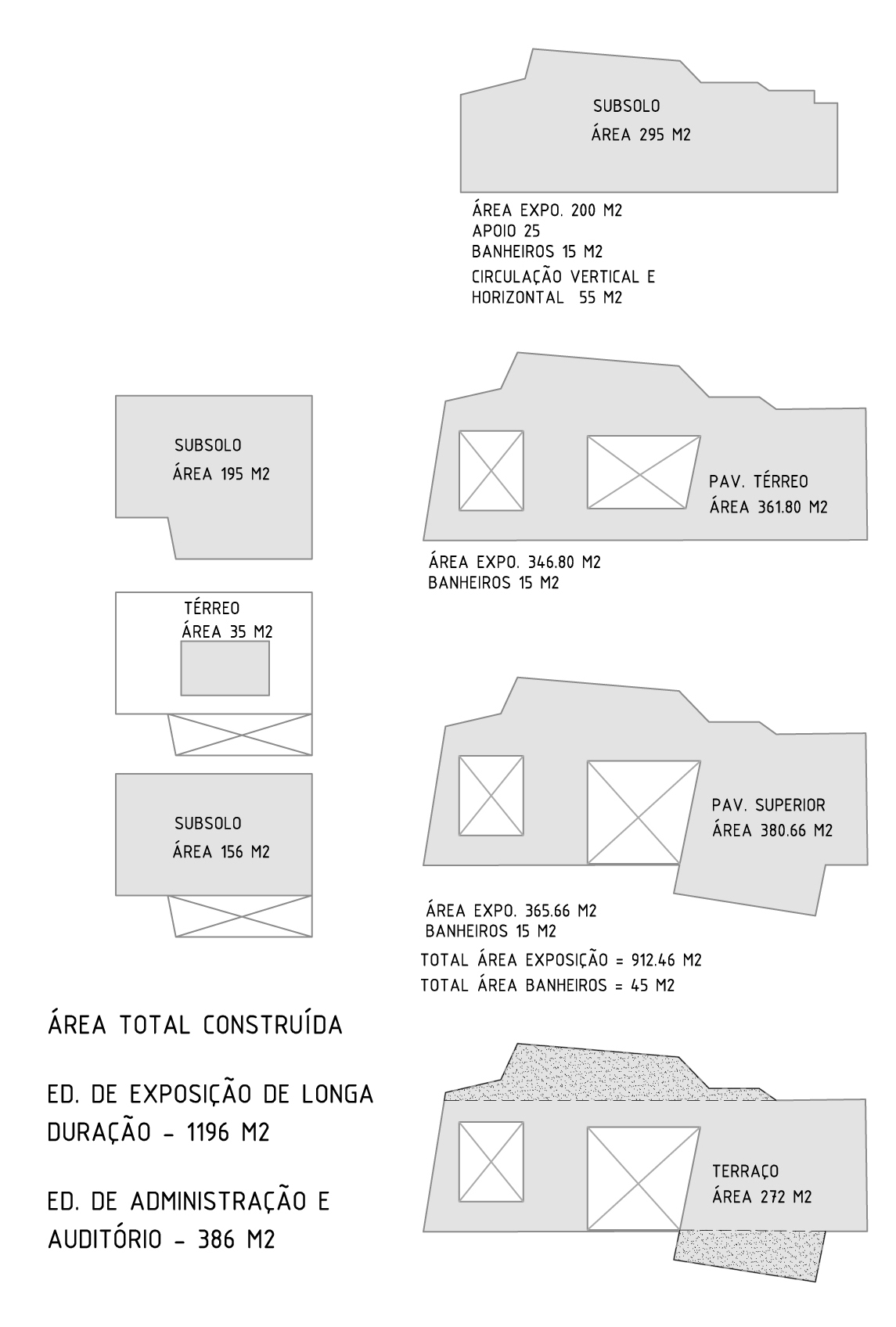 1.2 Fluxos: o estudo dos fluxos e percursos foi essencial na construção do raciocínio do projeto. Assim, aquele deck conector organiza a chegada dos onibus de excursões para crianças e idosos bem como do público em geral, conduzindo-os para a área entre o novo edifício e o edifício histórico às biilheterias que se encontram neste último. Daí os visitantes, após percorrê-lo em sua integridade, adentram através de uma ligação no nível 5,92 metros (nível do primeiro pavimento do edifício histórico), o novo edifício. Entram neste na cota 5,92, portanto e fazem um percurso de visitação nesse pavimento e descem ao térreo (cota 1,56m). Fazem o mesmo percurso e descem ao subsolo e, após visitar este pavimento, retornam ao térreo. Daí seguem um percurso rumo ao edifício do auditório, administração e grande bar / café terminando assim a visita junto a residencia pacheco leão, sem adentrá-la. Outros fluxos podem ser vistos nos esquema.