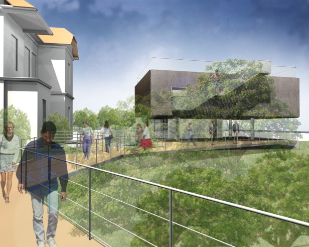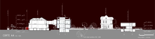 1.1 Conexão: uma solução que pudesse conectar todos os edifícios existentes e novos e o parque por meio de uma grande “estrutura-promenade” – um deck de madeira certificada em estrutura metálica apoiada em paredes de pedras – afim de constiuir uma unidade e um sentido de exposição continua, dentro e fora dos conjuntos edificados.