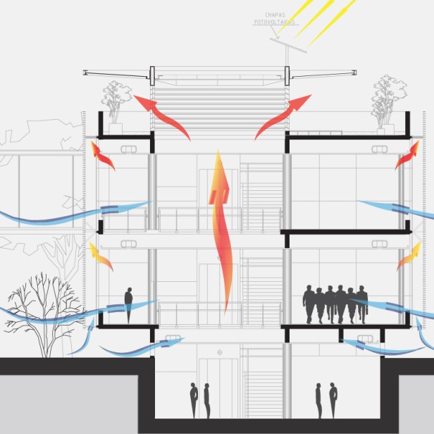 Ventilação – um sistema de captação do subsolo dos edifícios passando para os pavimentos superiores, através de aberturas naquele piso e na cobertura, permitem uma tipo de chaminé de ventilação. Estas aberturas são reguláveis, podendo-se utilizar ar condicionaddo de forma alternativa. Brises protegem as fachadas equilibrando a absorção de energia térmica com a luminosidade desejável.