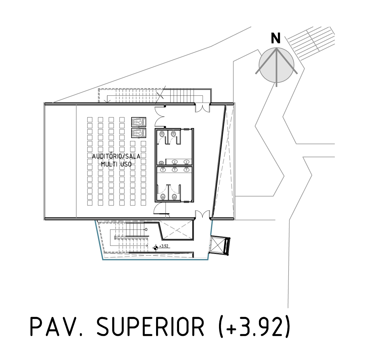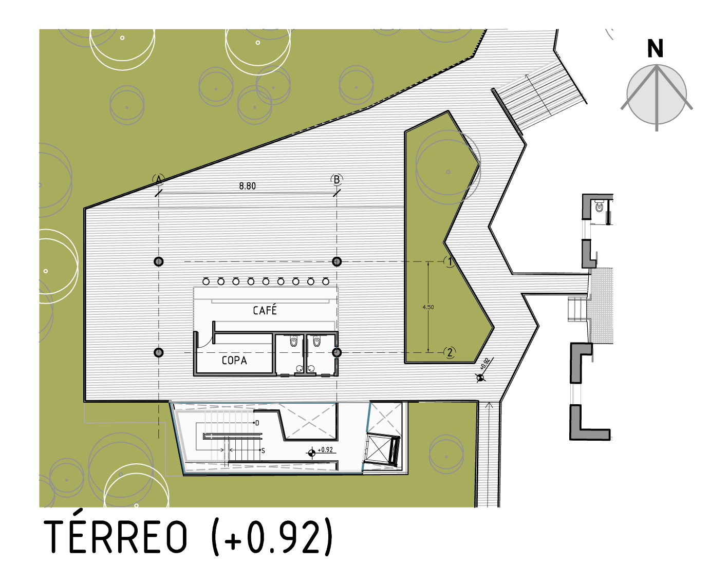 O edifício da adminstração, café e auditório (sala múltiplo uso), como ponta final do percurso, foi concebido para ser um marco importante, na medida em que irá receber pessoas no café e para a sala multi uso. Esta sala como um monolito sobre pilotis direciona vistas noroeste – sudeste para o exterior enfatizando a área junto ao centro de visitantes e a residencia pacheco leaõ.