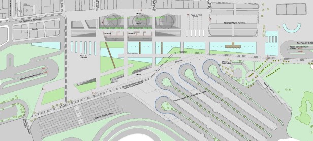 • Integração do sistema de transporte público em todas as escalas e modalidades num eixo circulatório coberto para pedestres que permita o deslocamento dos usuários com conforto.