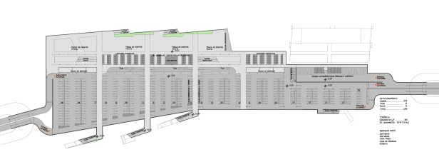 • Implantar o centro popular de compras no nível do subsolo da garagem para não interromper o visual da fachada oitocentista desde a borda contemporânea dos terminais e os percursos de aproximação através do parque urbano Diaz Velho.
