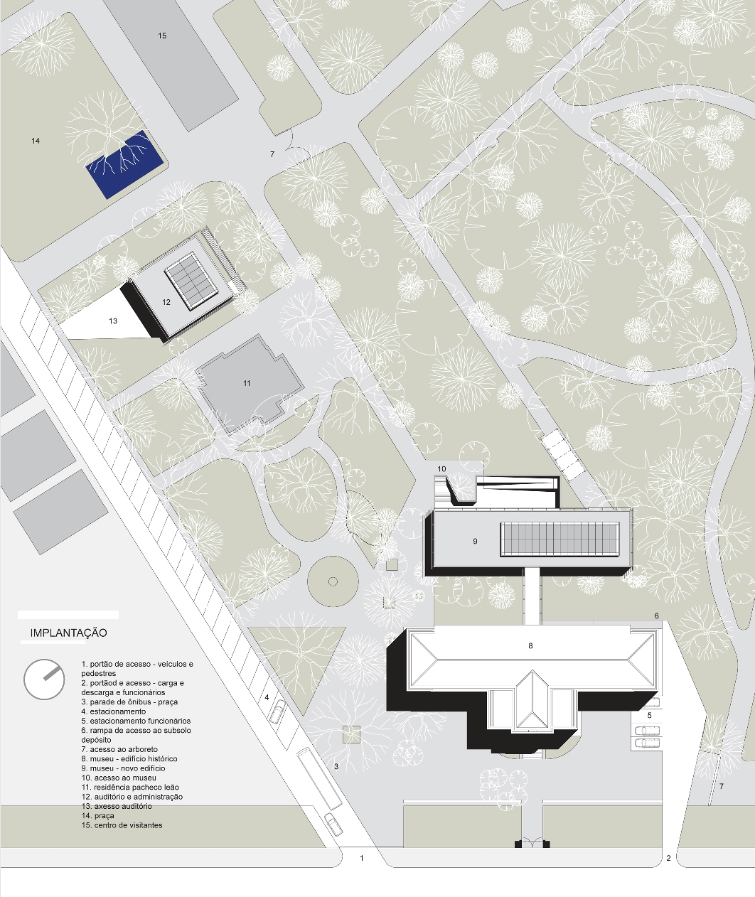 Tendo em vista as características do local, definiu-se uma implantação que visa principalmente à integração das novas edificações com seu contexto, respondendo as questões ambientais, históricas e tecnológicas. Essa necessidade de coabitação harmônica com um entorno tão delicado, condicionou o desenho das novas edificações em sua horizontalidade máxima estabelecendo assim uma escala controlada de convívio.