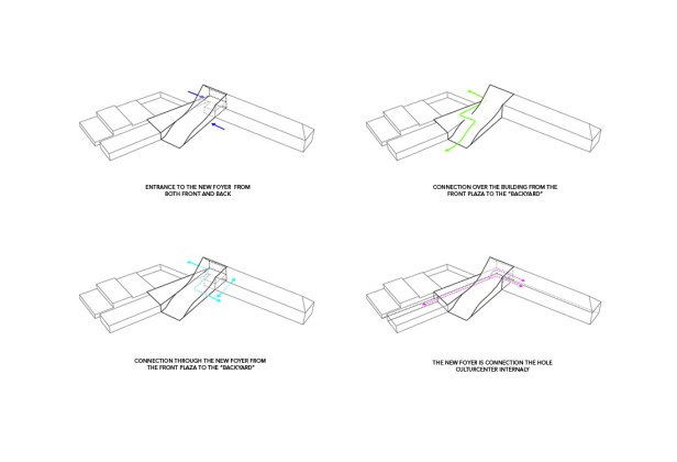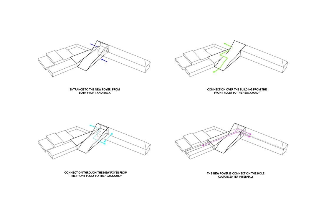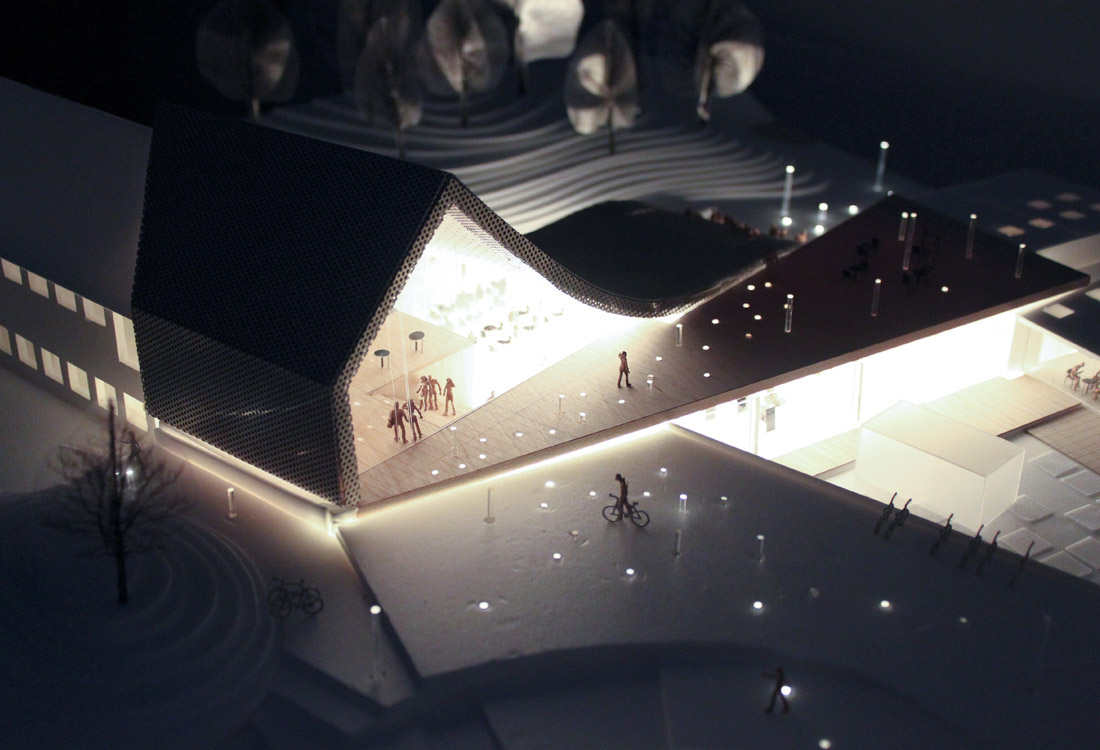 “O centro cultural se apresenta como um novo ‘foyer’, como uma nova face ao espaço existente, convidativo às pessoas da cidade de Ruderdahl, como um núcleo que reúne e ao mesmo tempo destaca as diversas atividades que ocorrem no lugar. O espaço construído se funde com a paisagem e preenche o vazio entre a área de chegada, a praça cultural e o belo pátio existente do centro Mariehøj.”