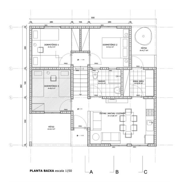 A estratégia de projeto é fornecer uma casa compacta que permita o crescimento da família e a adaptação da casa a pessoas portadoras de deficiência física. O layout de acessibilidade prevê a construção de mais um dormitório no nível da sala / banheiro / cozinha e serviço.