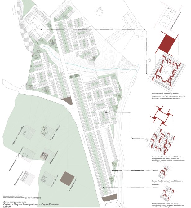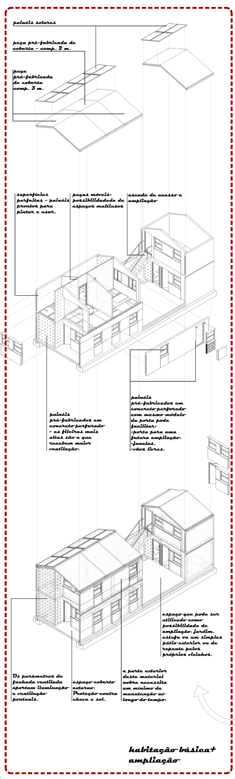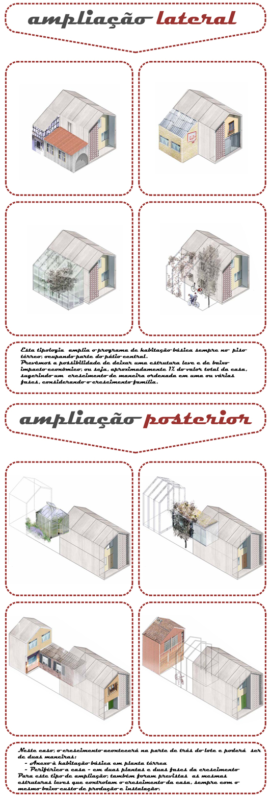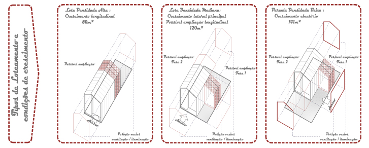 Em uma primeira fase as casas sempre crescerão no pavimento inferior, mas a medida que a densidade aumenta, as construcões poderam crescer para cima e/ou para fora, sempre dentro deste mesmo módulo estabelecido.