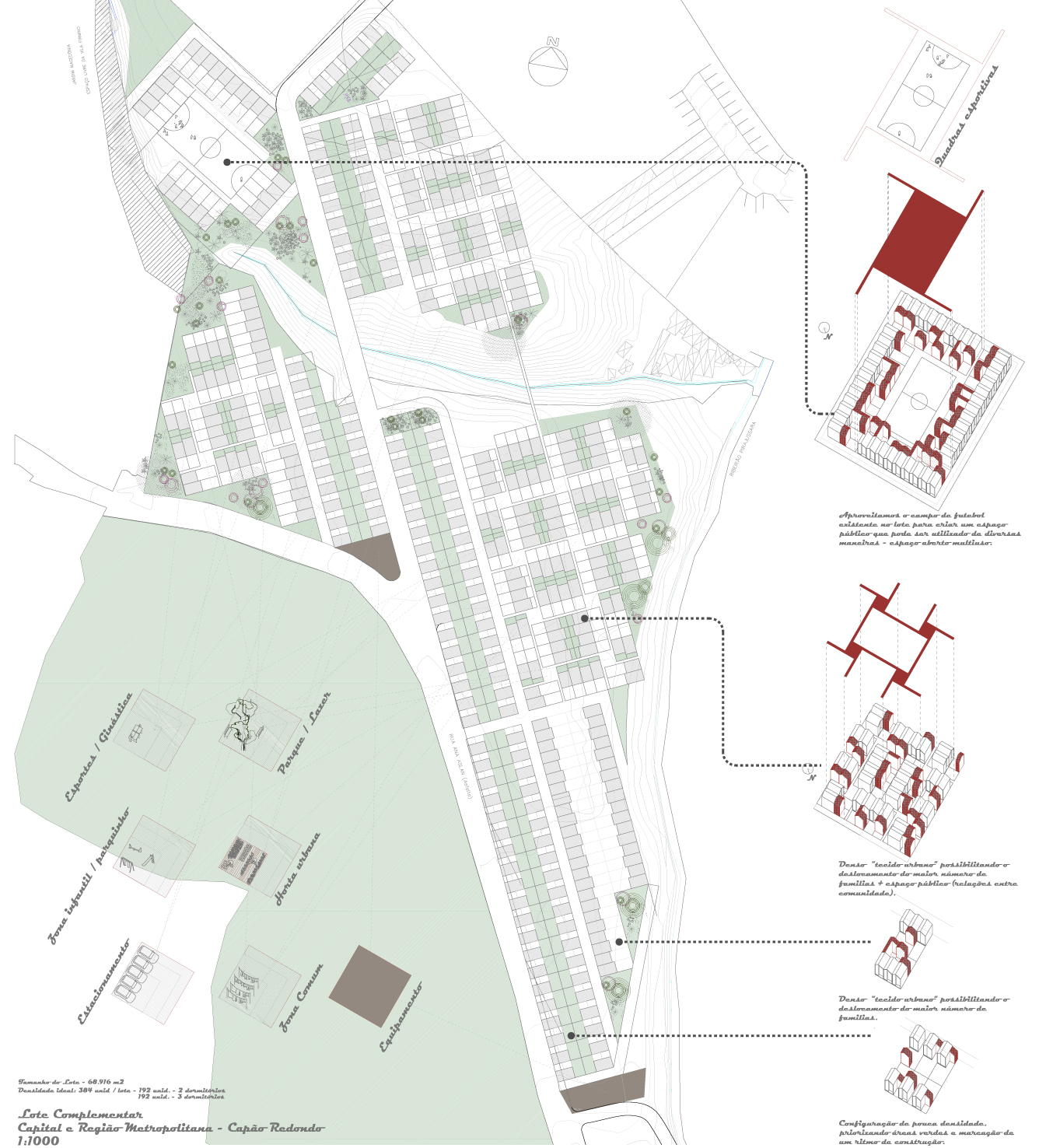 Partindo de um lote mínimo de 80m2, essas pequenas unidades habitacionais se configurarão de diferentes maneiras criando uma variedade de espaços públicos e privados, preservando visuais, ventilação e circulação.