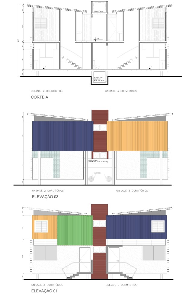 Captação de água pluvial (água cinza): A cobertura é inclinada favorecendo essa coleta por uma calha que filtra resíduos (folhas de árvores) e é encaminhada para um reservatório localizado no térreo. Essa água só pode ser utilizada para finalidade de regar jardins. Proveniente do uso doméstico: cozinha, lavanderia e chuveiro. Coletado por um reservatório localizado imediatamente abaixo dos banheiros, que é o local onde há a maior concentração de coleta proveniente dos banhos. Essa água deve ser filtrada com alto grau e reutilizada para as mesmas funções como também para a descarga dos vasos sanitários.