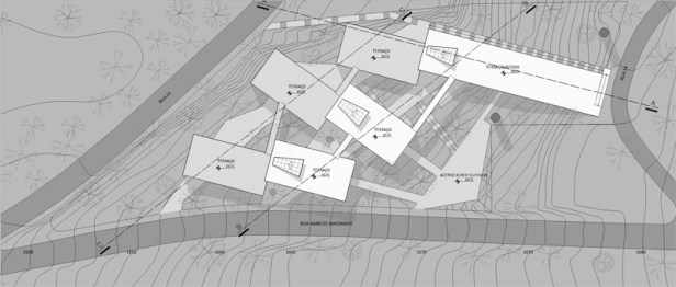No caso específico deste terreno em Campos do Jordão, as lajes/terraços de cobertura destes edifícios, blocos interligados e deslocados verticalmente estão todos respectivamente nas curvas 1679 e 1670.