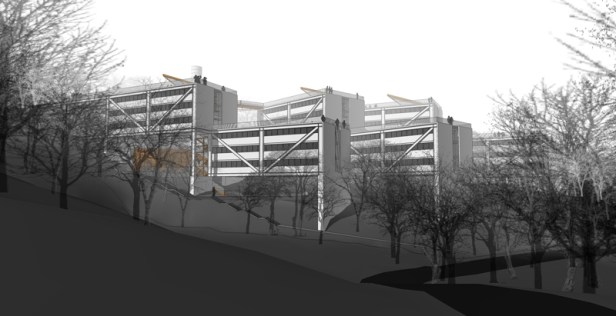 Para facilitar esta difícil ocupação eliminando cimbramentos e movimentos de terra propusemos as grandes treliças estruturais em aço articuladas com lajes e paineis de fechamento pré fabricados que permitem a montagem mais ágil da obra no local.