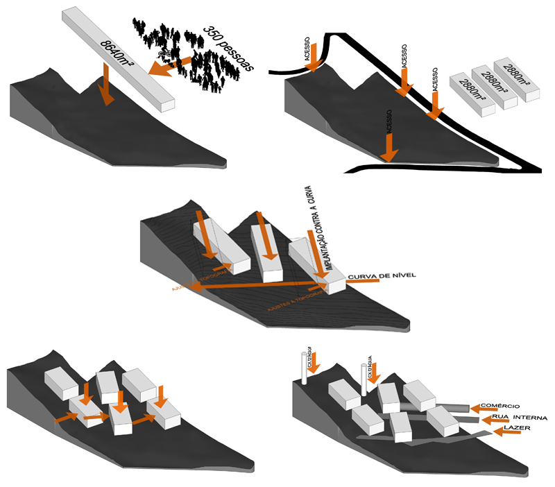 O projeto volta-se para a ocupação de encostas em geral por se desenvolver contra a curva de nível. Por isso os edifícios pouco tocam o solo e consequentemente como que flutuam no ar, permitindo uma extraordinária apreensão da paisagem.