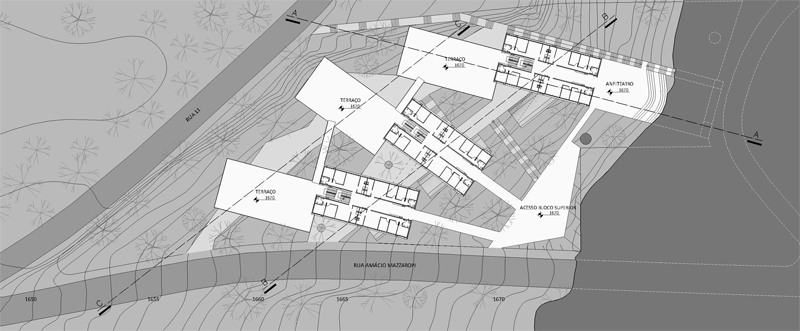 No caso específico deste terreno em Campos do Jordão, as lajes/terraços de cobertura destes edifícios, blocos interligados e deslocados verticalmente estão todos respectivamente nas curvas 1679 e 1670.