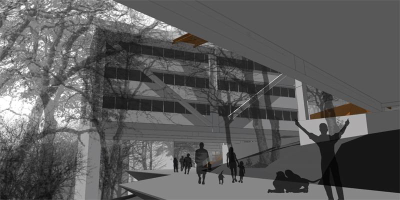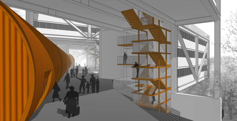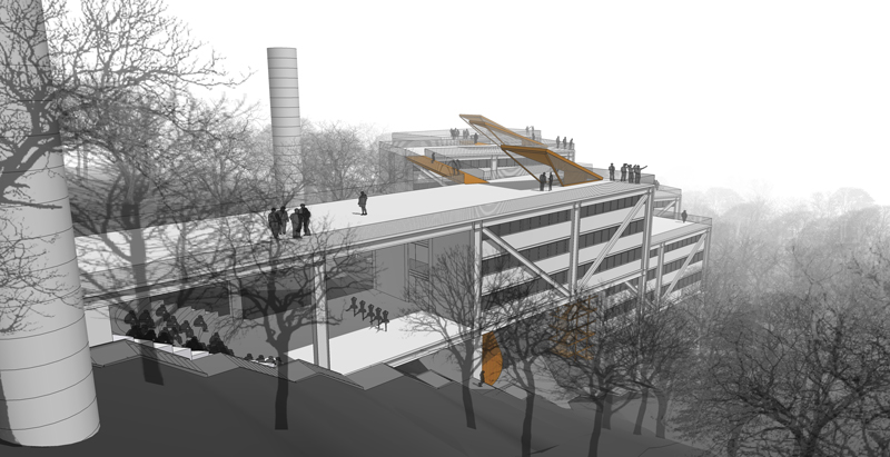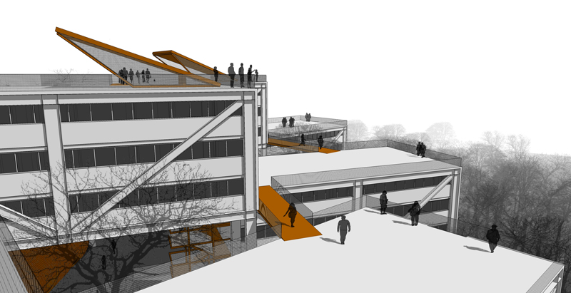 Para facilitar esta difícil ocupação eliminando cimbramentos e movimentos de terra propusemos as grandes treliças estruturais em aço articuladas com lajes e paineis de fechamento pré fabricados que permitem a montagem mais ágil da obra no local.
