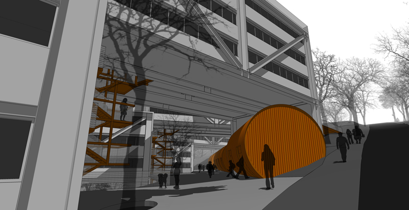 O comércio, um tubo longitudinal, corre ao longo da curva 1.661, por baixo dos edifícios assim como a laje de lazer, que corre em curva mais baixa (1656) estreitando e alargando, às vezes no ar.