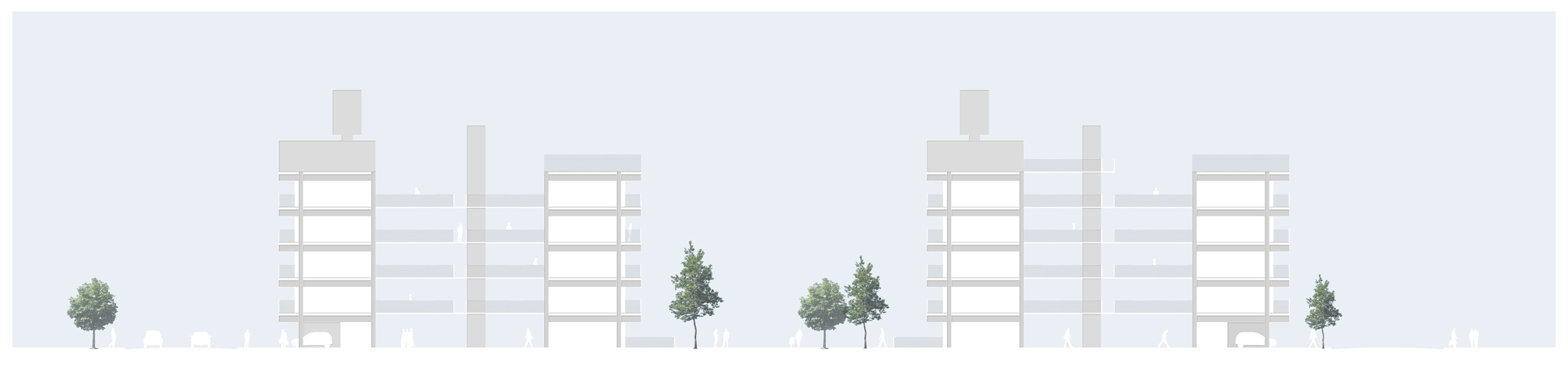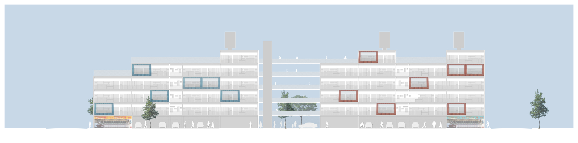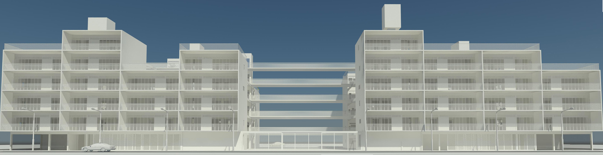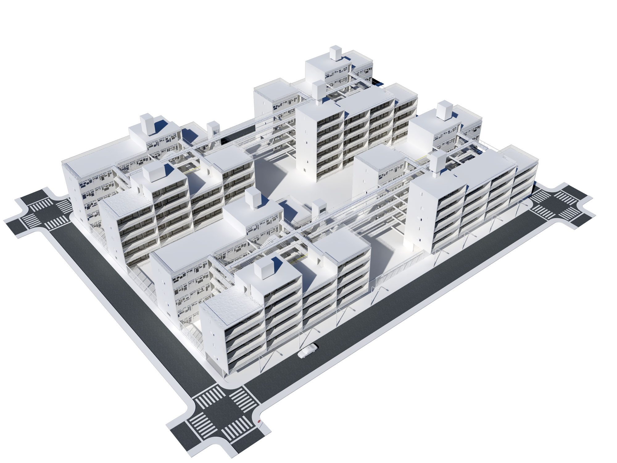 Os prédios são concebidos seguindo uma lógica industrial. O uso de elementos estruturais e lajes de concreto armado prefabricado assim como o uso de painéis composite de vidro encaixilhados, conduz à realização de economias de escala favoráveis a melhorias dos tipos de apartamento. Decidimos trabalhar com quatro objetivos principais: o aumento potencial em 30% da área do apartamento por meio da criação de uma “varanda reversível” de fora a fora do apartamento, a otimizição da ventilação natural e a biorientação dos apartamentos através de um formato de prédio alongado em corpos separados, o acesso à luz natural e ao conforto de uso por meio da criação de painéis de vidro nas salas e a criação de uma rede externa comum de circulação vertical. O espaço reversível potencializa a capacidade de crescimento e de emancipação do núcleo familiar. Sem defi-nição programática e formal, este abriga atividades impossibilitadas pelo confi¬namento do espaço do apartamento e se torna um lugar de expressão livre. Sem restrição quanto ao uso, para atividades culturais, produtivas ou comerciais, o espaço reversível vai expressar nas fachadas do prédio a vitalidade e a criatividade da comunidade que o abriga.