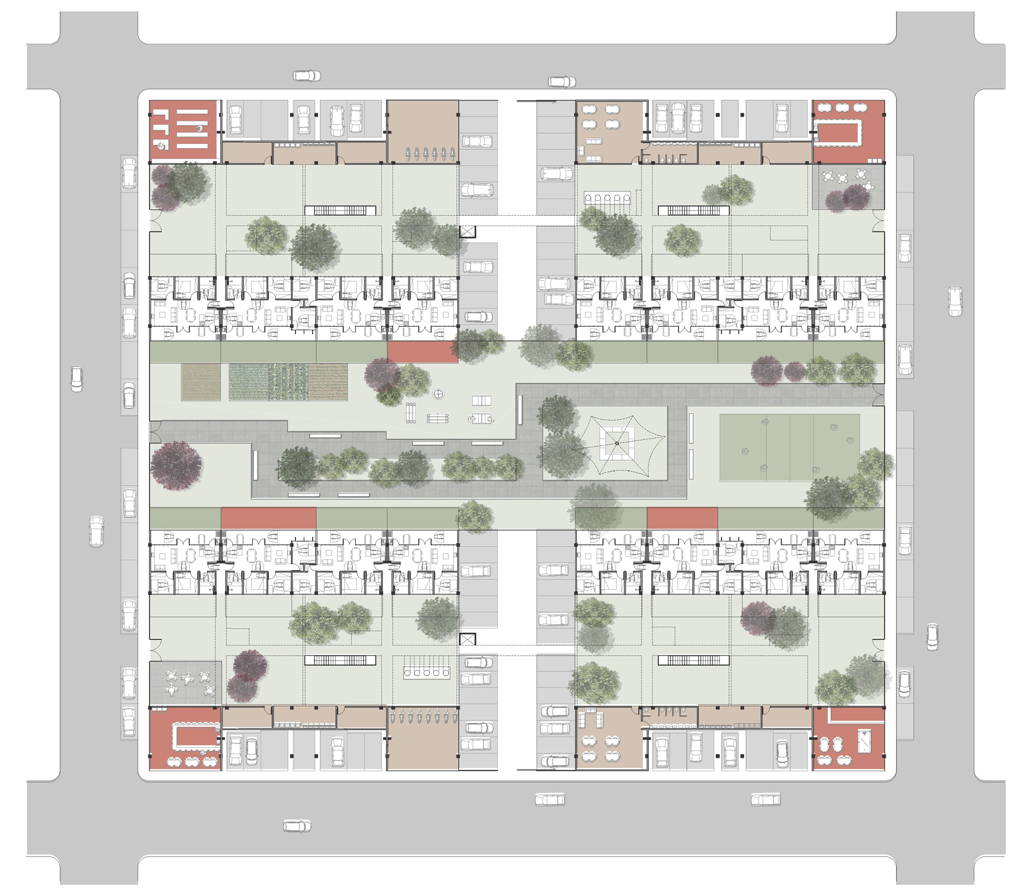 Queremos propor a realização de condomínios integrados à malha urbana, defi¬nindo uma hierarquia clara dos diversos espaços do projeto, do apartamento ao espaço público. O objetivo é dividir a gestão dos espaços coletivos entre indivíduo, condomínio, comunidade e poder público, preservando características urbanas. Os corpos dos prédios vêm no alinhamento das vias de circulação, abolindo o uso de cercas ou muros perimétricos. O diálogo direto com a cidade é reforçado por implantação de comércios nas esquinas e acesso direto de garagem. Uma hierarquização em camadas que vêm pontuar cada nível, com espaços claramente de-finidos e identi¬cáveis, com funcionamento e acessos diferentes, buscando mecanismos naturais de autogestão e preservação.