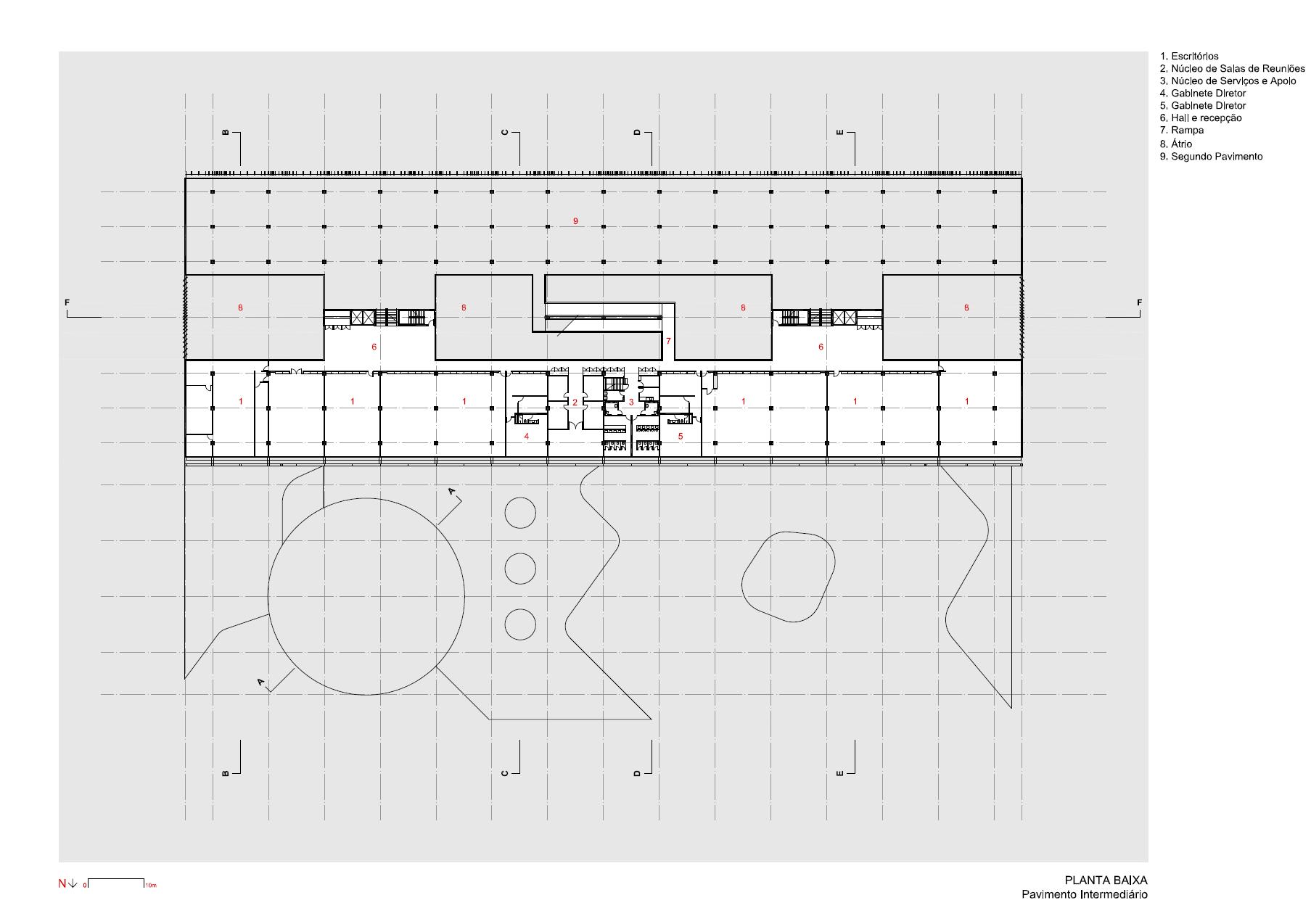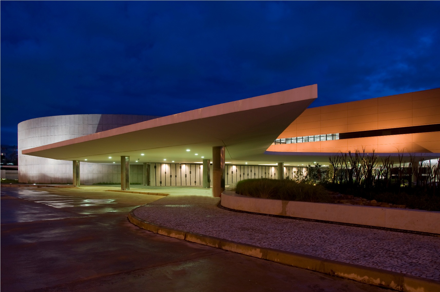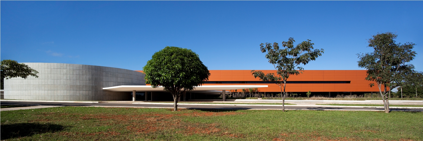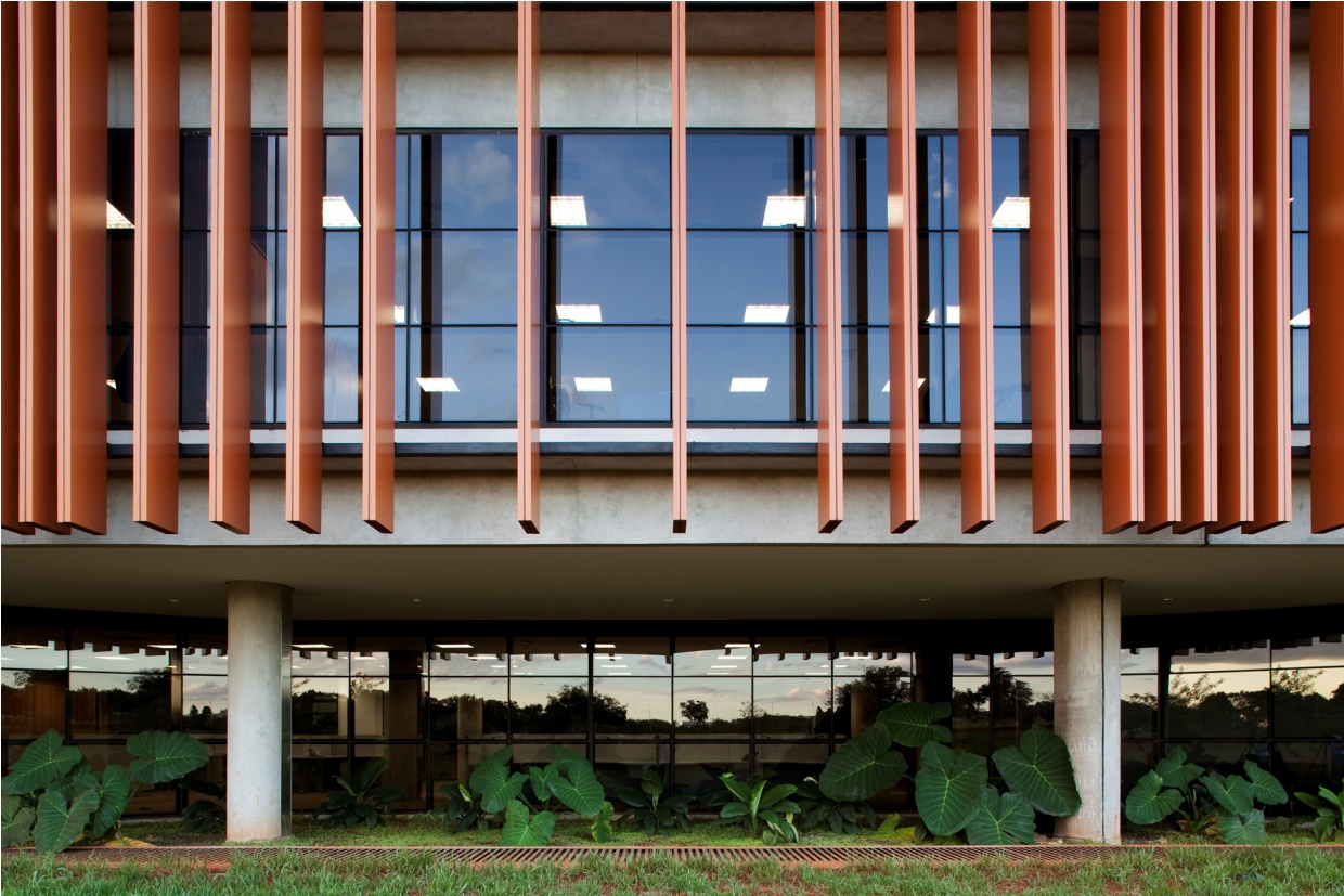 Foi utilizado o concreto moldado in loco em lajes nervuradas, com fôrmas pré-fabricadas de fibra de vidro e vigas-faixas niveladas com as nervuras das lajes. A solução foi adotada por ser aquela que permite maior vão estrutural com relativa economia. Assim, os vãos de 10mX6,25m (com 2,5m de balanço longitudinal e 5m de balanço nas extremidades) puderam ser vencidos com 35cm de espessura. O piso elevado em 20cm e o forro modular adotado nos escritórios foram exigência do edital. A partir daí, foi definido o fechamento das empenas leste e oeste em concreto aparente, bem como a panos de vidro nas fachadas norte e sul, complementados por brise-soleil verticais nesta última e por uma placa solta na fachada norte. Ambos os elementos de proteção solar foram feitos de estrutura de aço – perfis dobrados compostos – revestida com alumínio composto (Alucobond cor “Copper-Penny”). Todo o edifício foi modulado em 1,25m – estrutura, divisórias, esquadrias. revestimentos e forro.