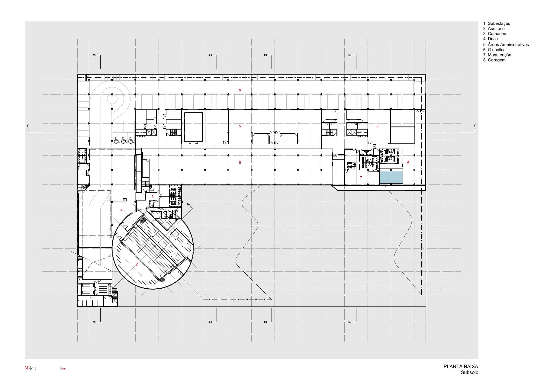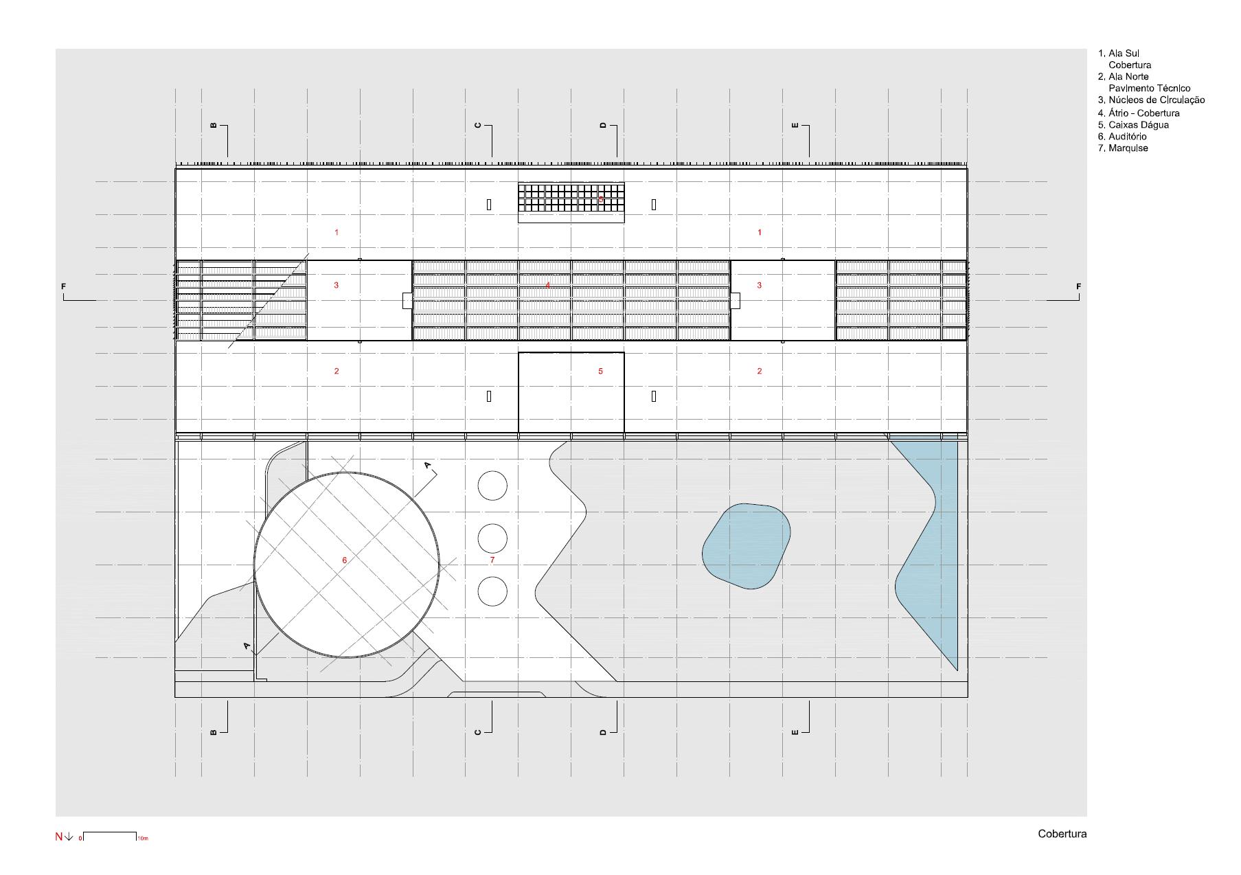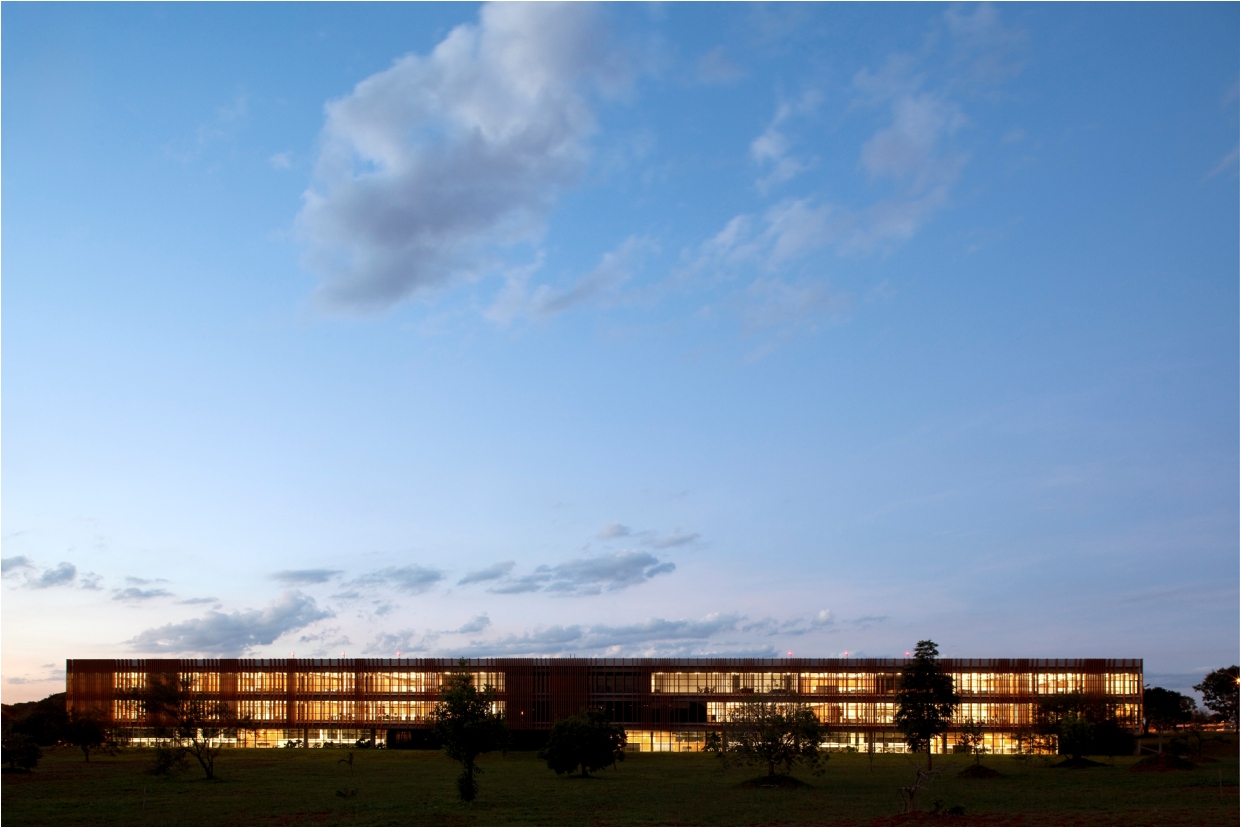 Foi utilizado o concreto moldado in loco em lajes nervuradas, com fôrmas pré-fabricadas de fibra de vidro e vigas-faixas niveladas com as nervuras das lajes. A solução foi adotada por ser aquela que permite maior vão estrutural com relativa economia. Assim, os vãos de 10mX6,25m (com 2,5m de balanço longitudinal e 5m de balanço nas extremidades) puderam ser vencidos com 35cm de espessura. O piso elevado em 20cm e o forro modular adotado nos escritórios foram exigência do edital. A partir daí, foi definido o fechamento das empenas leste e oeste em concreto aparente, bem como a panos de vidro nas fachadas norte e sul, complementados por brise-soleil verticais nesta última e por uma placa solta na fachada norte. Ambos os elementos de proteção solar foram feitos de estrutura de aço – perfis dobrados compostos – revestida com alumínio composto (Alucobond cor “Copper-Penny”). Todo o edifício foi modulado em 1,25m – estrutura, divisórias, esquadrias. revestimentos e forro.
