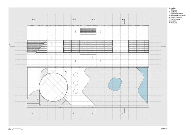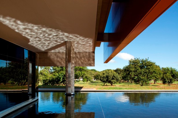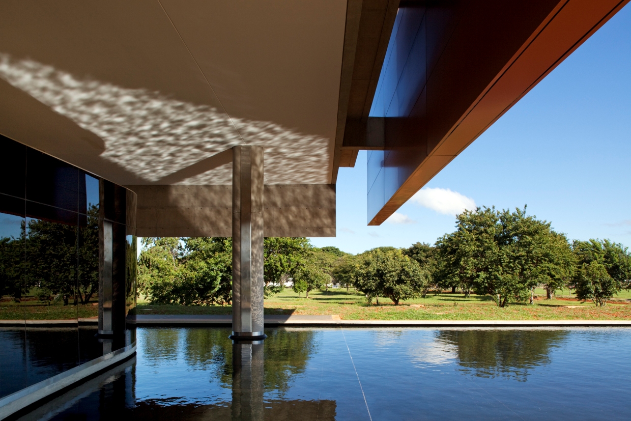 O paisagismo complementa o conjunto em relação mimética com o cerrado adjacente e em desenho referente à praça Duque de Caxias – de Burle-Marx – próxima.