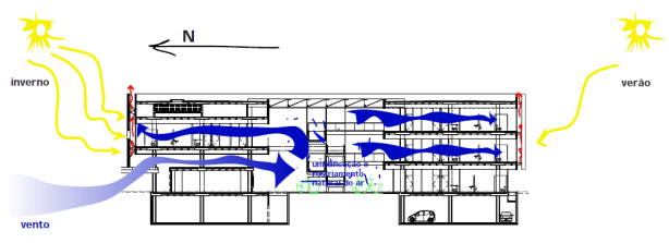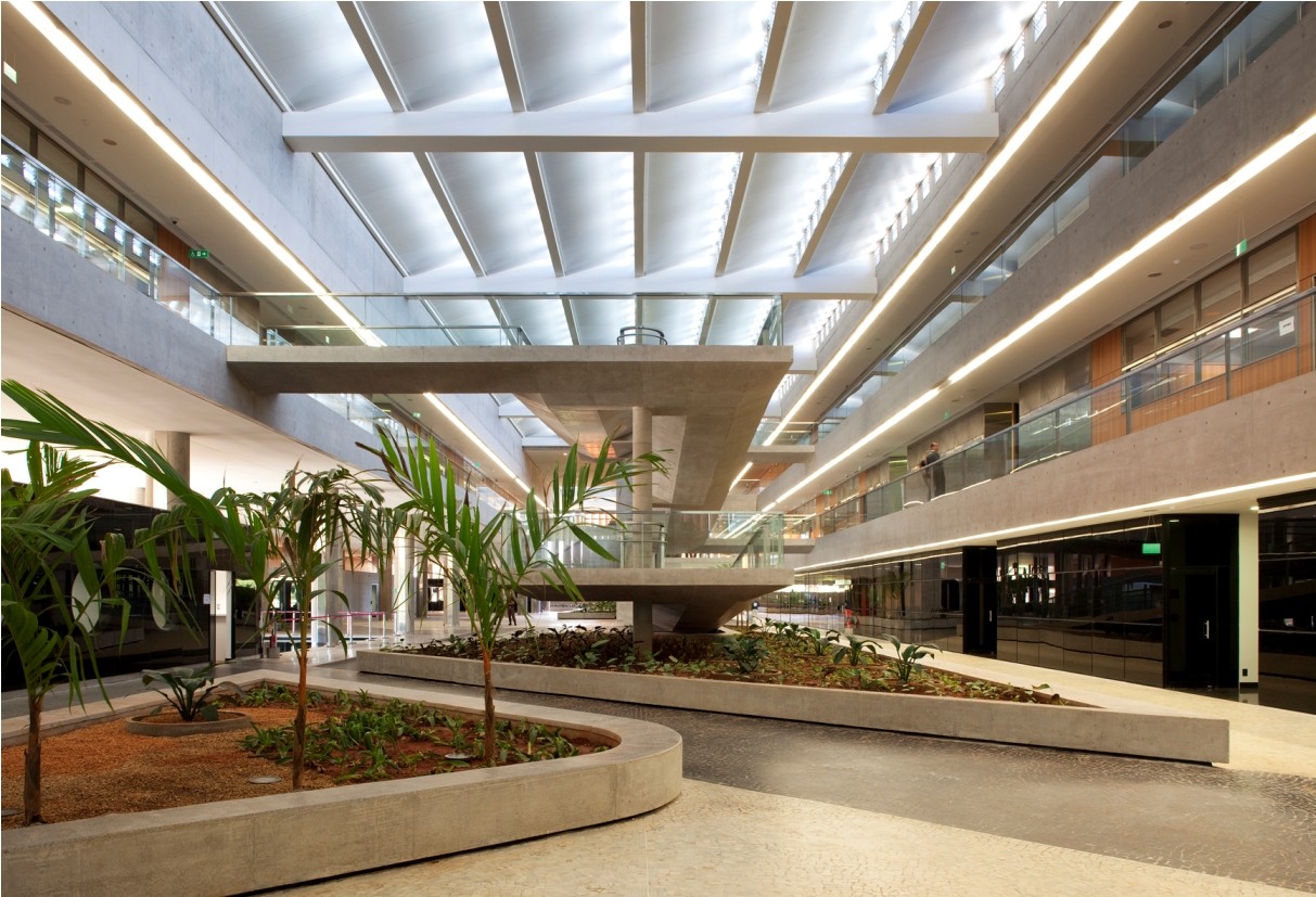 Especialmente no que diz respeito ao conforto ambiental e à economia de energia. Com o átrio interno e as placas de proteção solar externas, acreditamos que será possível realizar em grande parte do ano a ventilação passiva nos pavimentos. Isso será possível também graças ao sistema de condicionamento de ar tipo VRF (Fluxo de refrigerante variável), com compressores que variam a quantidade de gás refrigerado de acordo com a demanda. Foi recomendada a exigência de certificação ambiental para todas as madeiras adotadas. Evidentemente, sustentabilidade passa pelo uso de tecnologias locais, pelo uso de fôrmas reaproveitáveis, pela própria racionalidade e economia da solução construtiva adotada, premissas que também fundamentaram o projeto. Sobre o conforto acústico, houve especial atenção para o tratamento apropriado e específico para cada tipo de ambiente do programa e suas particularidades de uso, o que resultou em soluções e materiais específicos para cada caso: as áreas de escritório e reuniões; o átrio central (espaço de convivência e circulação); e em especial o auditório de 700 lugares, que foi objeto de consultoria e projeto acústico específico.