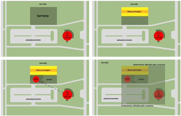 Trata-se de um lote de 100mX150m no setor militar urbano de Brasília, nas proximidades do eixo monumental e adjacente ao Oratório do Soldado – obra de Milton Ramos. Procurou-se integrar o Oratório, o estacionamento frontal e a sede da FHE em um só conjunto. Por isso, encostou-se o edifício na porção sul do terreno e o auditório circular (refletindo a forma do Oratório) na porção leste. Assim o conjunto abrangeria uma área maior, criando-se uma praça de entrada. A marquise em formas livres foi uma consequencia natural dessa decisão de implantação, permitindo o acesso independente ao auditório e o desembarque coberto pela frente do terreno, sem a necessidade de vias internas. Como não há lotes adjacentes, a delimitação do terreno foi sinalizada com o espelho d’água a oeste.