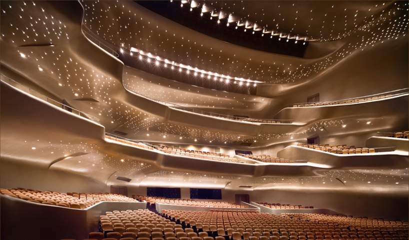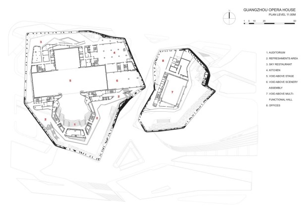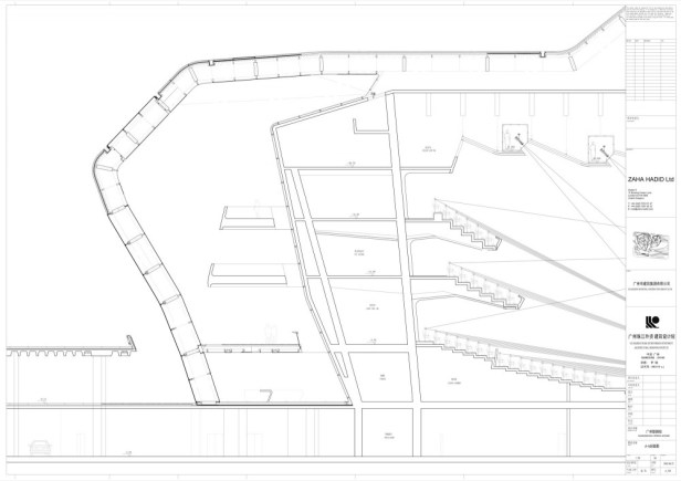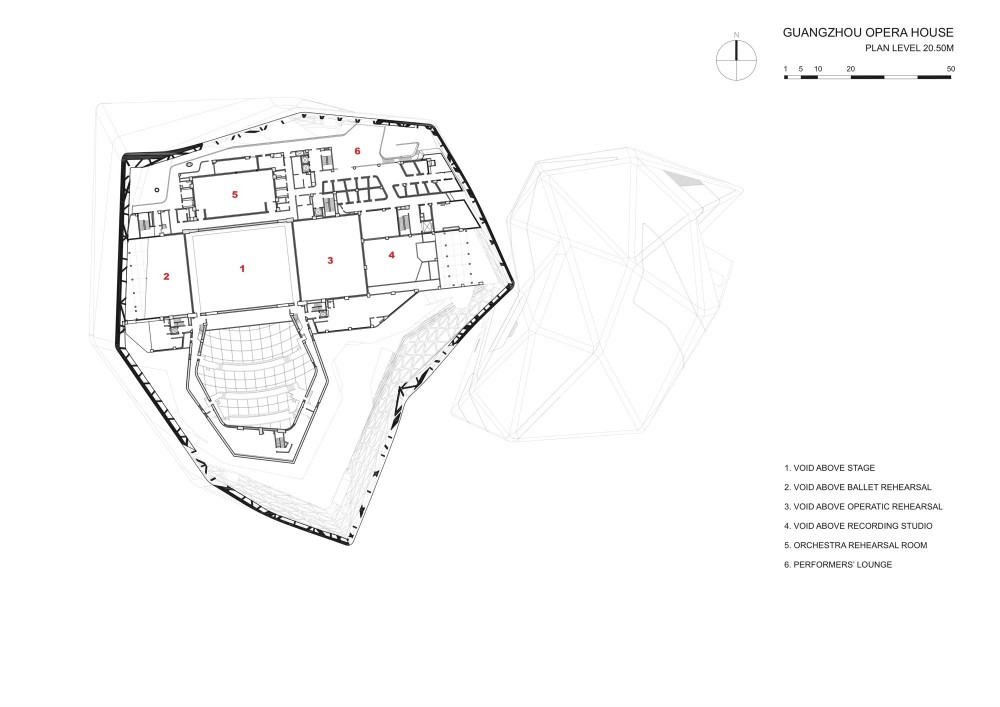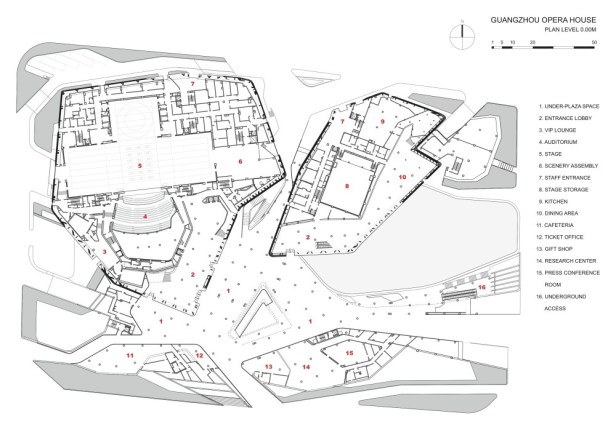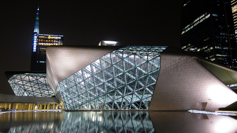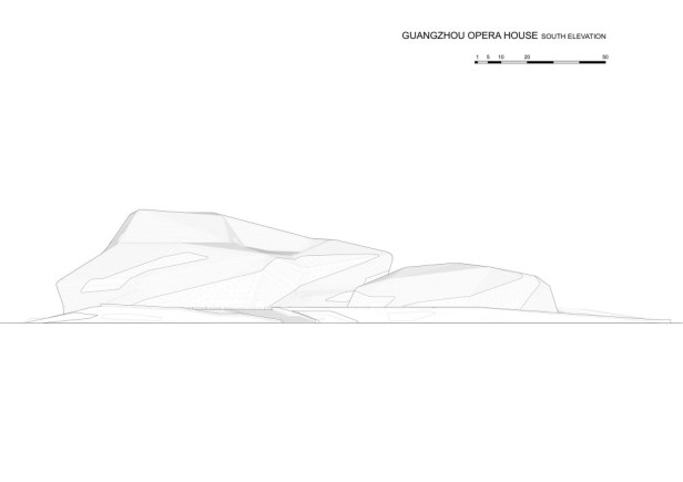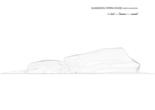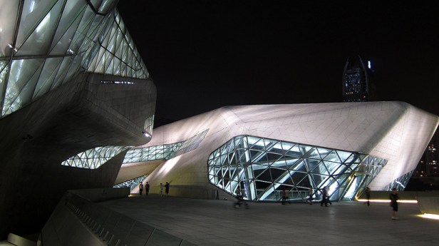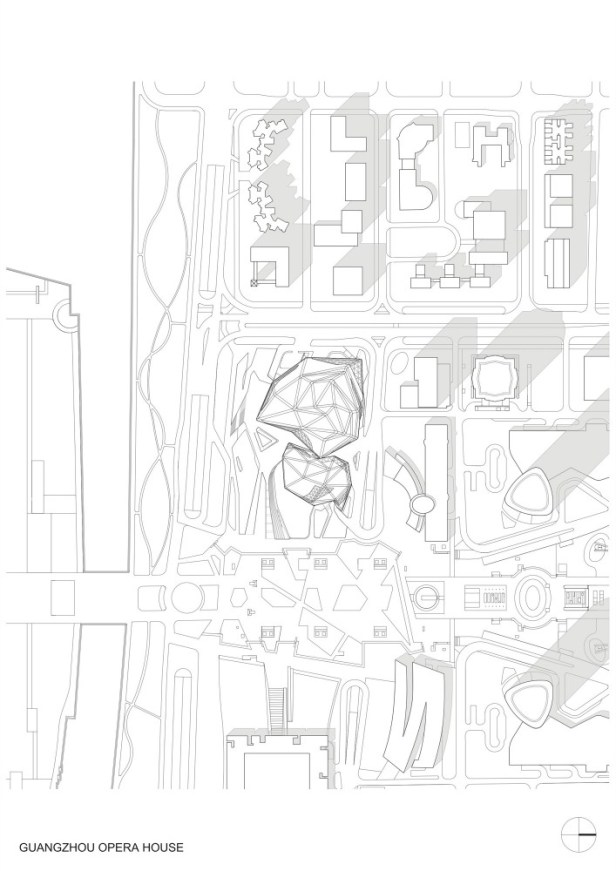 O conjunto edificado inclui um teatro de 1.800 lugares, hall de entrada, espaço multifuncional, instalações de apoio e está localizado ao sul da área central de Guangzhou, na margem norte do Zhūjiāng (Pearl River), com área total construída em torno de 70.000 m2. À época do concurso o júri destacou: “a forma irregular e escultural da edificação, assim como a composição simples de materiais – vidro e concreto, criam um forte contraste visual em relação à paisagem. Os dois elementos da composição, separados porém relacionados, dão um sentimento de força do espaço. O projeto se destaca também pela organização dos fluxos entre a área central da cidade e a edificação e mantém boa relação com o contexto urbano e o rio. O vazio entre os dois elementos da composição arquitetônica não apenas se configura como um espaço para a reunião do público como também valoriza o próprio conjunto edificado. A funcionalidade e a exequibilidade do projeto de Zaha Hadid é superior aos demais concorrentes” (Fonte: http://www.glaserworks.com – Fan Wang).