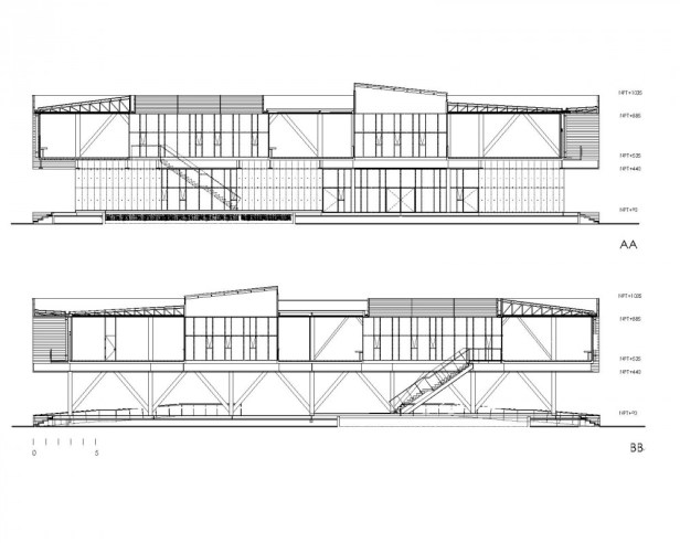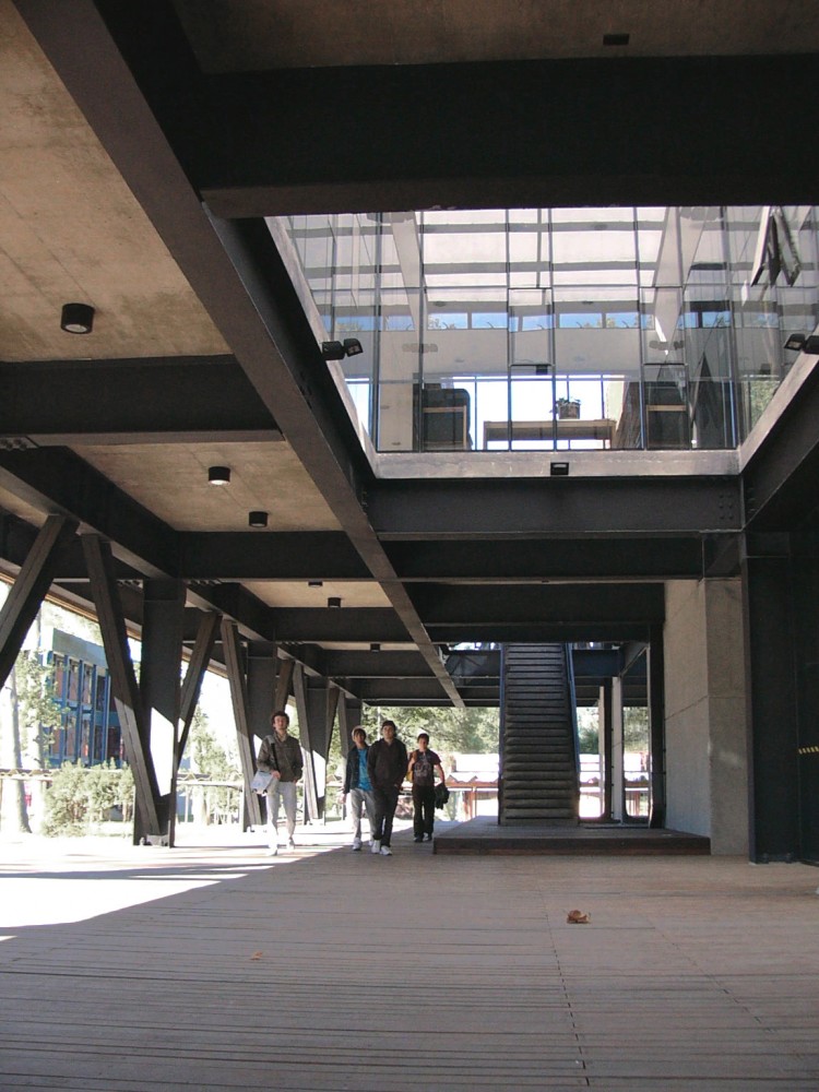 Potencializando o caráter público e aberto da Universidade, liberou-se parte do primeiro nível, constituindo um corredor coberto para os pedestres, sobre uma plataforma de madeira elevada, acima da cota de inundação, protegida dos ventos vindos do norte (que acompanham as pesadas chuvas características da região).