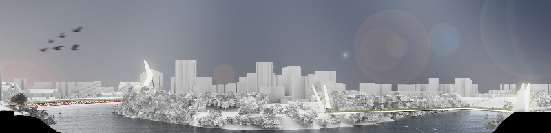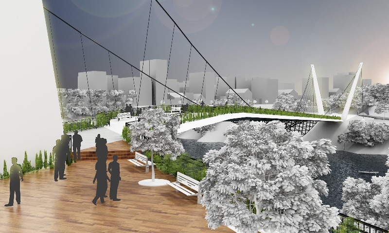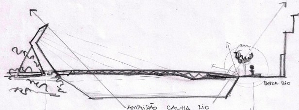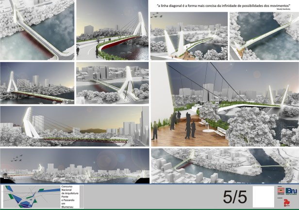 Já para a passarela, adotou-se o sistema estrutural tipo pensil. Sua forma dinâmica e assimétrica, cria um ambiente de movimento – uma superfície vibrante, que através de suas entradas com aberturas diagonais, convida o pedestre a atravessar. Podendo ser chamada também de Praçarela, será composta por um largo passeio e ciclovia, além de uma praça, que faz a transição da Rua Itajaí, e ainda um mirante na parte mais alta, que avança sentido ao rio, com a visão ampla da prainha e do centro da cidade.