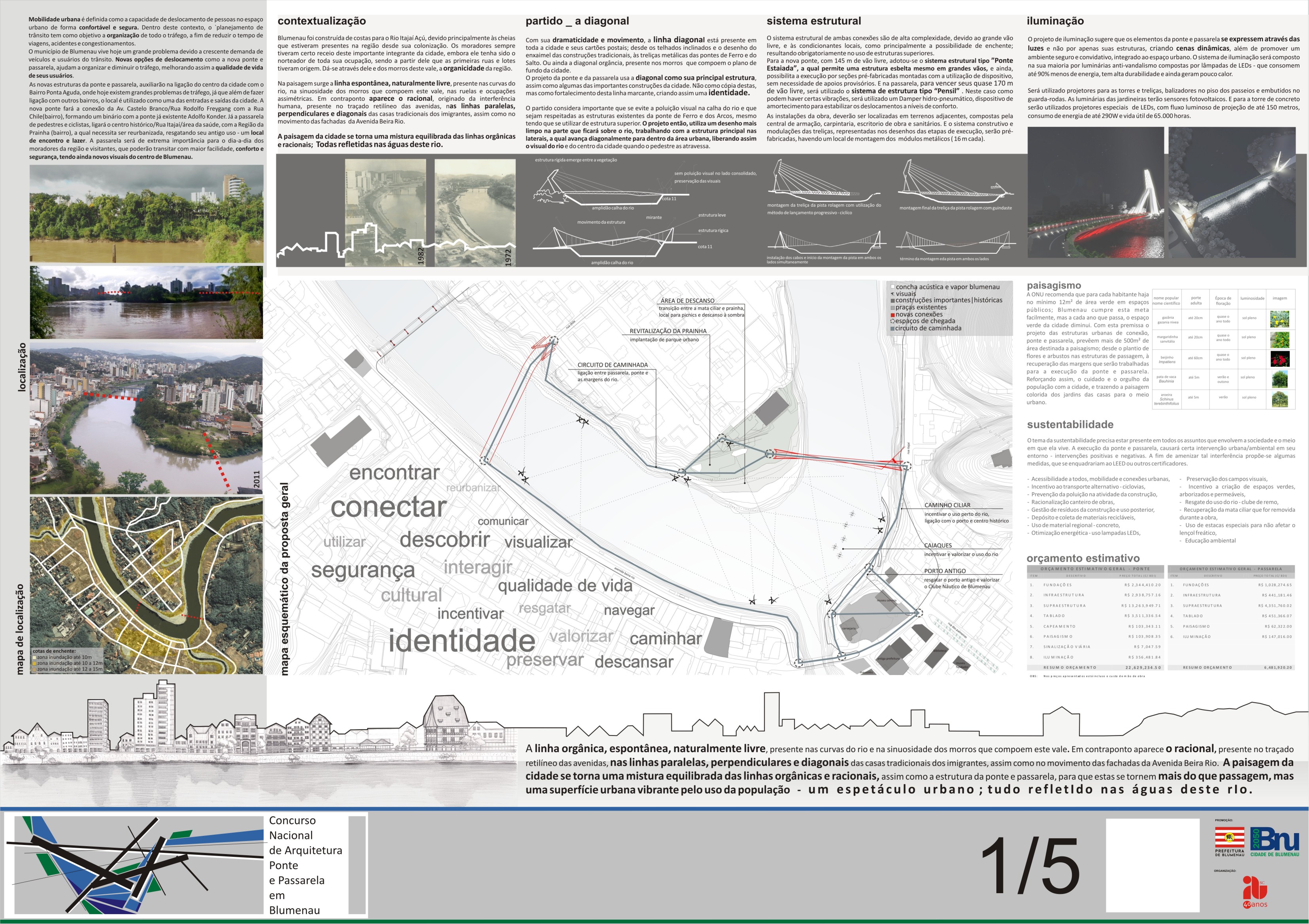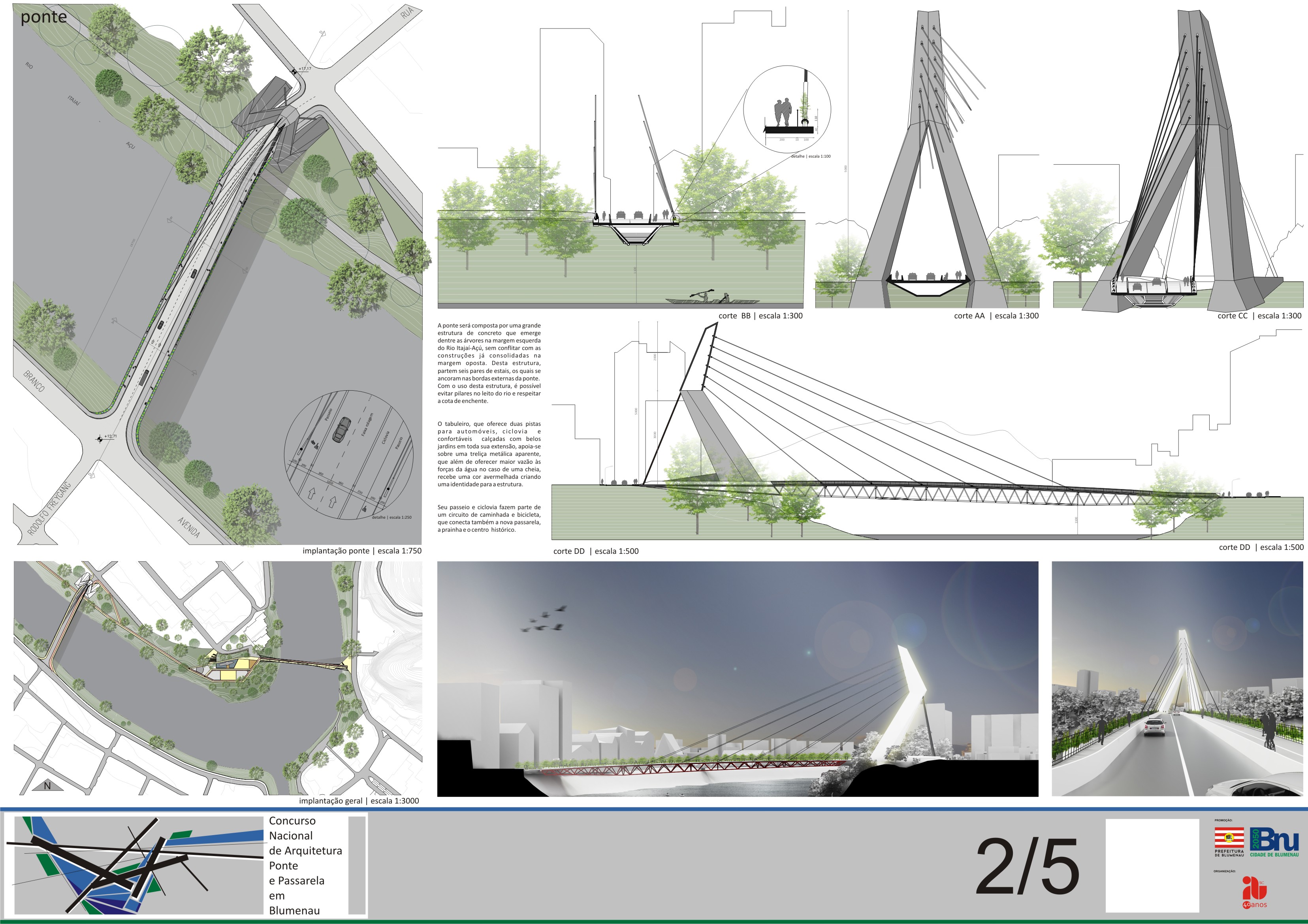 O projeto das novas conexões utiliza a linha diagonal como sua principal estrutura, fortalecendo esta linha marcante da cidade, a qual se repete em toda paisagem, desde os telhados inclinados e no enxaimel das construções tradicionais, às linhas sinuosas do morros que compoem este vale. Apartir desta linha, surge então a forma principal das novas estruturas de conexão, que partem do princípio de evitar a poluição visual na calha do rio, respeitando ainda as estruturas já existentes da ponte de ferro e dos arcos. Sendo assim, o projeto utiliza um desenho limpo sobre o rio, trabalhando com as estruturas principais nas suas laterais, que avaçam diagonalmente para dentro da área urbana, liberando o visual do rio. E ainda fazendo referência a um símbolo da cidade, os passeios de ambas estruturas serão contornados por coloridos jardins, os quais permitem uma travessia mais confortável e bonita.