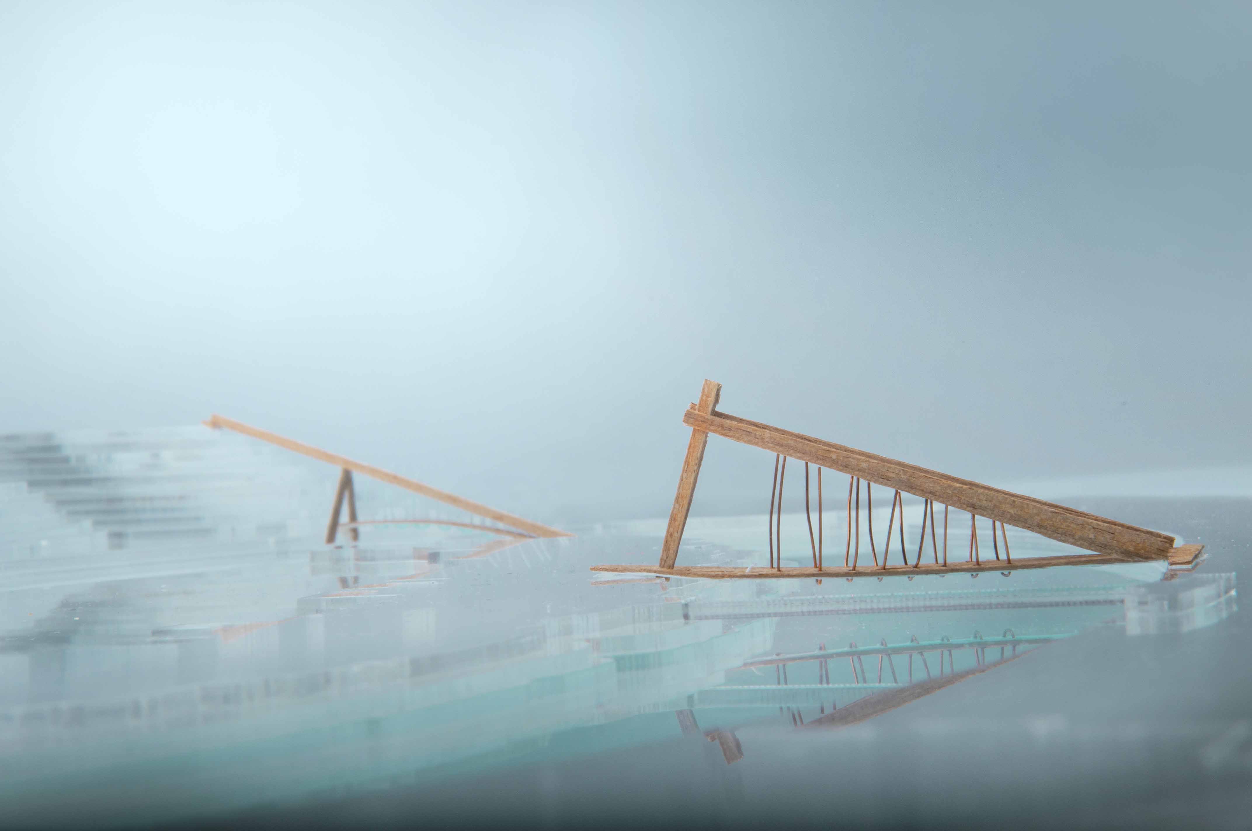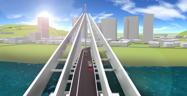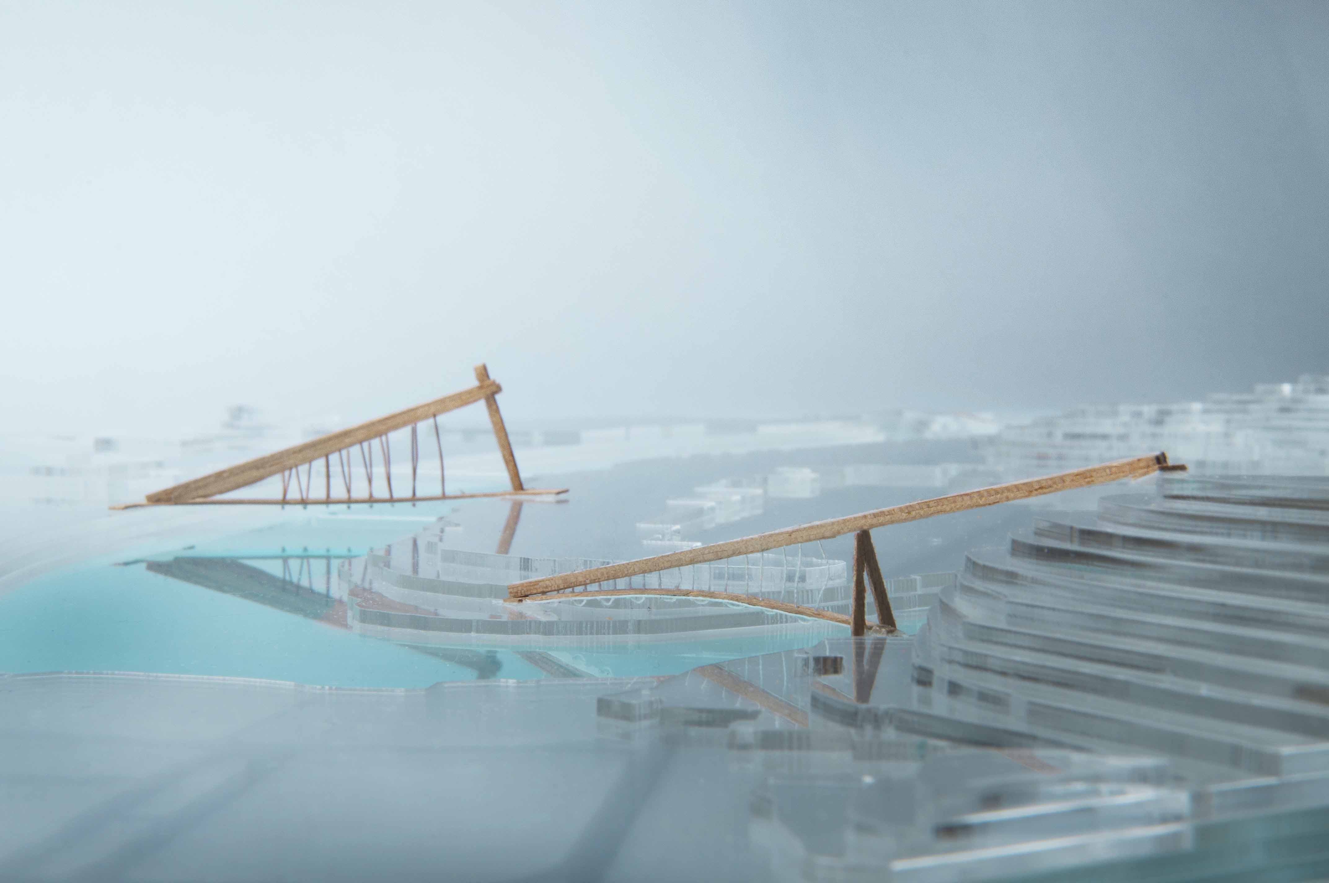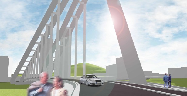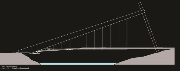 A ponte e a passarela dialogam na paisagem com as vigas inclinadas, que por vezes estão paralelas e por outras se cruzam na paisagem. A ponte terá no sistema viário uma rampa, no primeiro trecho, para atingir a cota 17,50 do cruzamento com a rua Uruguai. Isso permite maior liberdade na solução estrutural do último trecho, em que a ponte terá um apoio central e um vão de 30 metros até o tirante do eixo T. Esta rampa também levará o motorista a observar a perspectiva formada pelas grandes vigas de concreto.