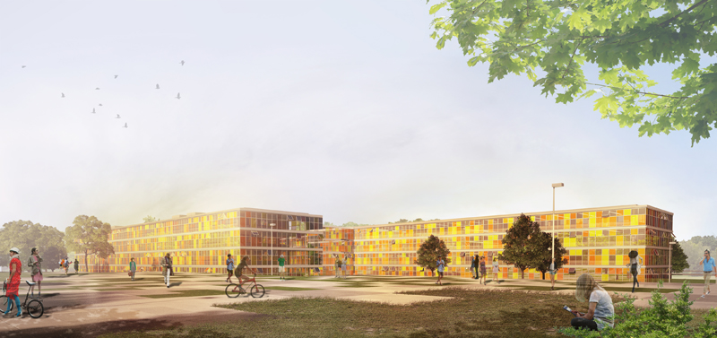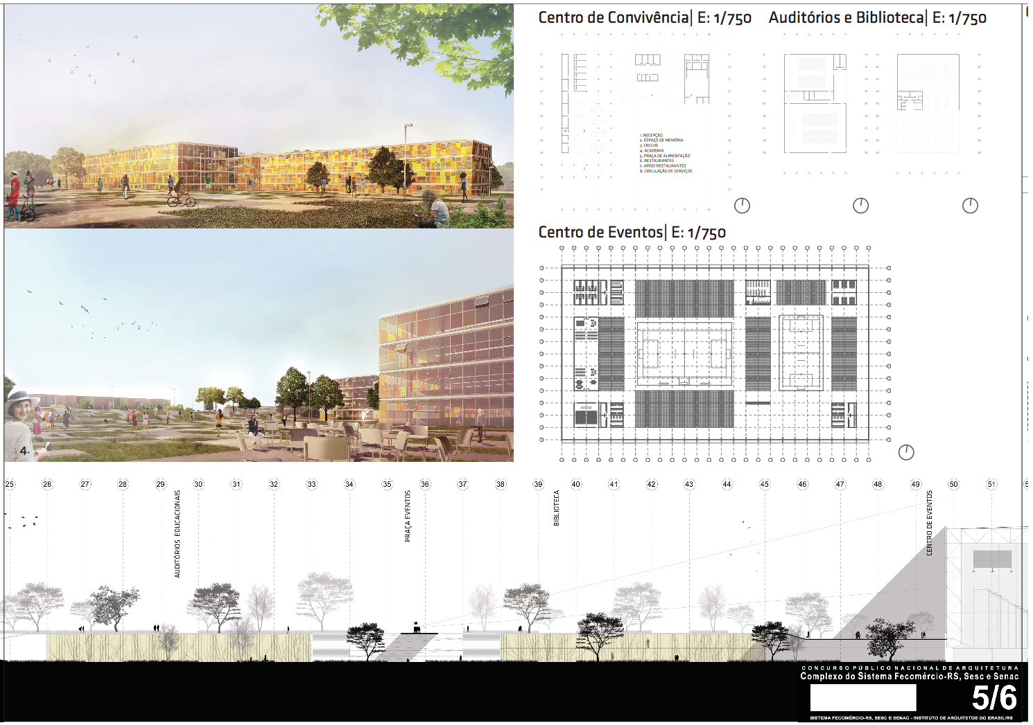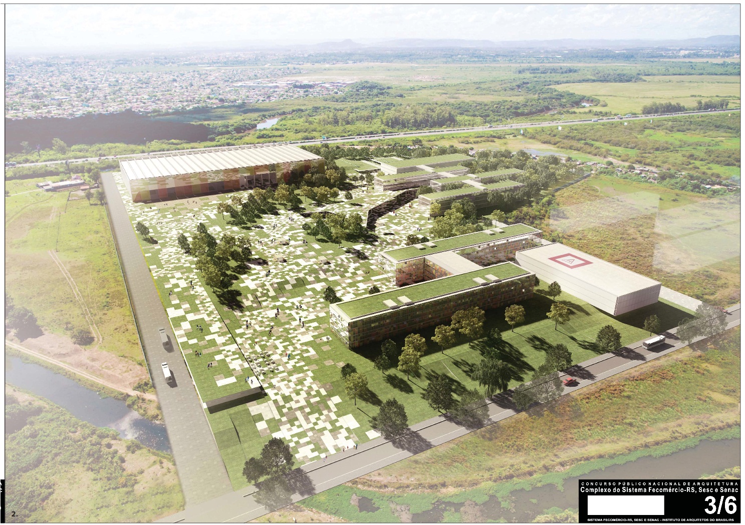 A proposta contempla a horizontalidade do lote, interpretada por meio de placas dispostas em diferentes alturas, acomodando todas as funções do projeto, cada qual em seu nível hierárquico. A diferenciação dos acessos principais das edificações construídas se dá sempre na cota intermediária. Para estabelecer a hierarquia das edificações, optou-se por uma estratégia que concentra as funções do centro administrativo na entrada principal do complexo. O encaminhamento e conexão dos transeuntes no complexo se dão através do centro de convivência. O centro de eventos que, por principio, não necessita de isolamento acústico e possui uma escala maior que os outros prédios, se localiza na interface com a rodovia, calibrando a percepção hierárquica da proposta. O prédio da escola do Senac se encontra em um lugar bucólico, rodeado por trilhas e vegetação. Os auditórios e a biblioteca foram locados de maneira independente, catalisando atividades a partir da área central do complexo. As vagas de estacionamento se localizam na base no terreno, configurando, acima delas, uma topografia alternativa que forma desde grandes praças até pequenos recantos e trilhas para caminhada e ciclismo. Contemplou-se a divisão em fases construtivas permitindo que cada edifício funcione de maneira independente e com o número necessário de vagas de estacionamento. Estratégias sustentáveis como pavimentação permeável, cobertura verde, aproveitamento de água e aquecimento passivo foram potencializadas pela escolha da mais adequada orientação solar para implantação dos edifícios, reduzindo a necessidade de climatização artificial.