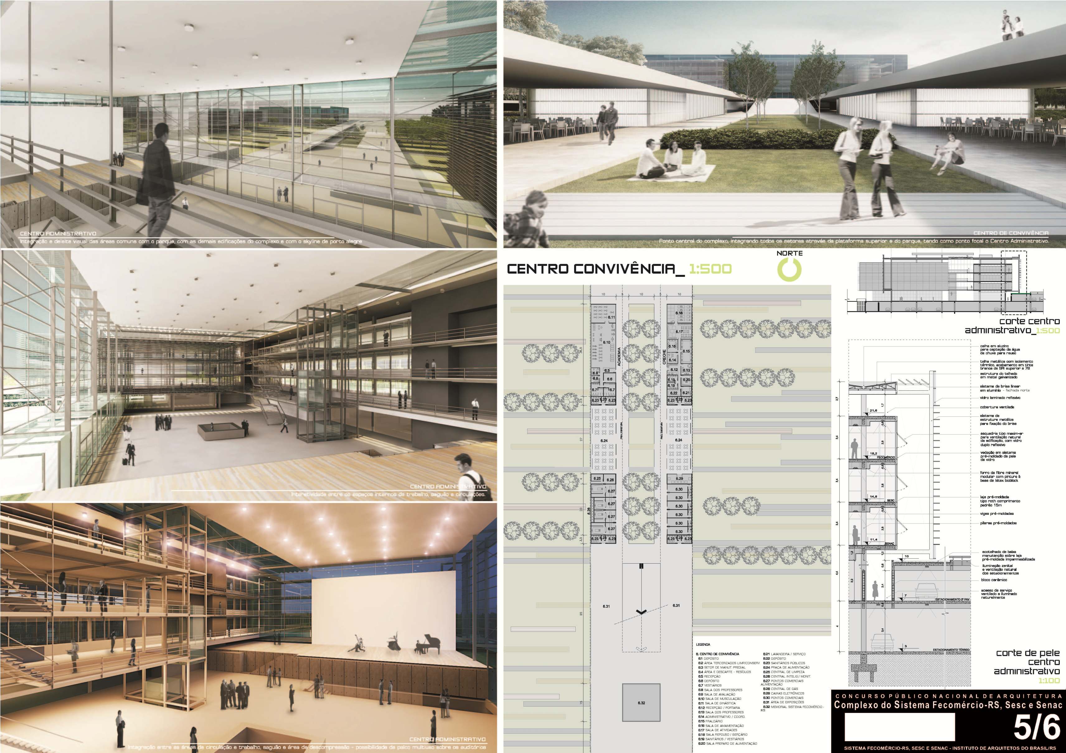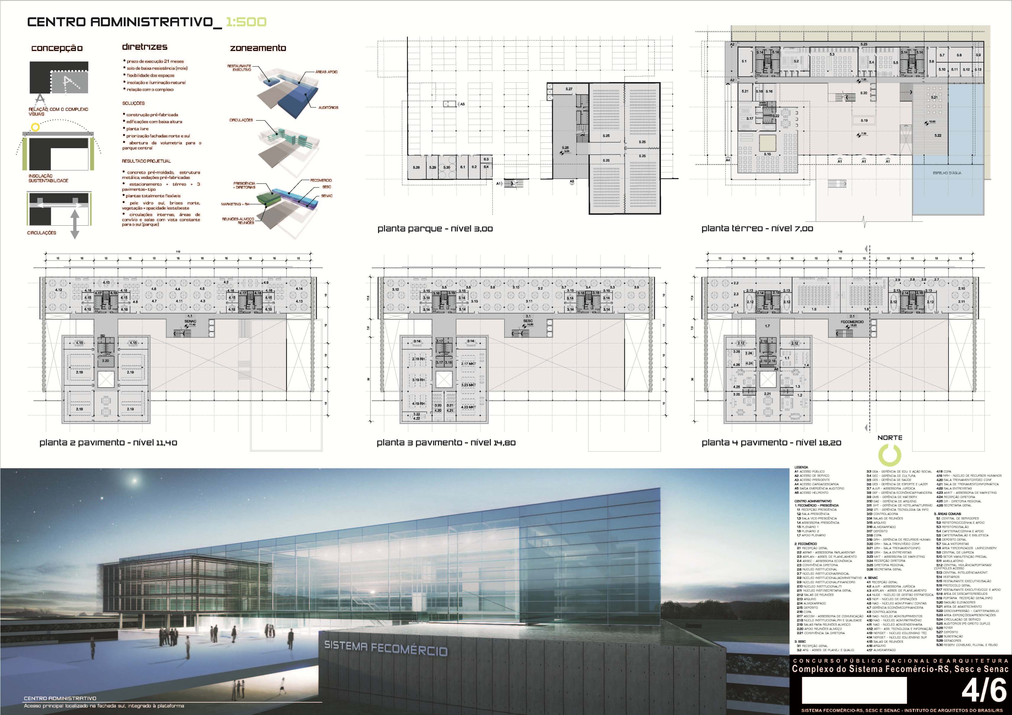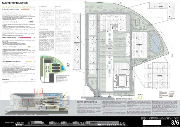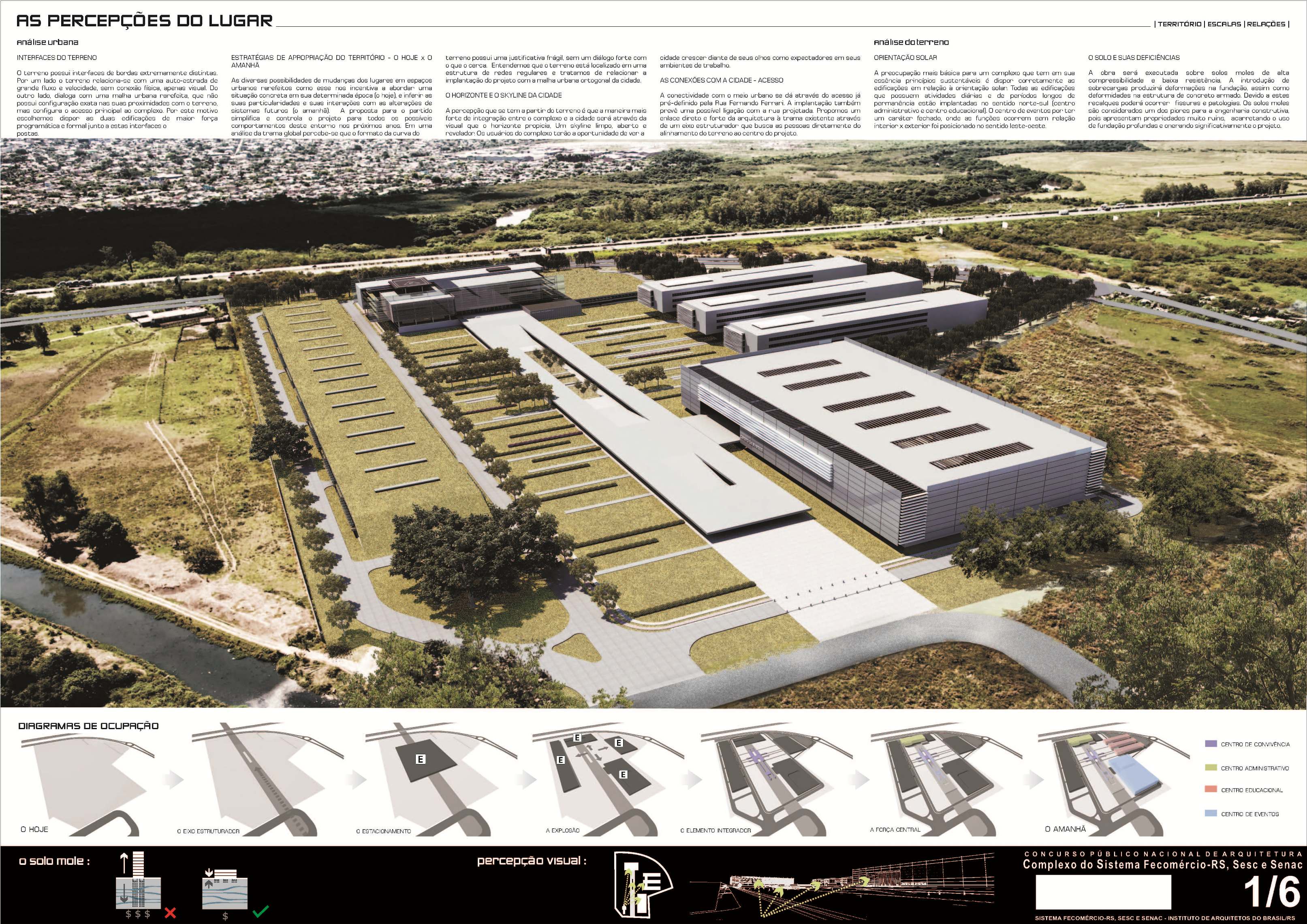 A vasta dimensão do lote nos levou a certeza de que as edificações deveriam se estender por todo o território, deixando uma grande área verde interna conformando um parque – onde locamos de forma linear o Centro de Convivência. Buscou-se a orientação geral do observador ao chegar no local, compreendendo a força do Sistema Fecomércio através de um reconhecimento imediato de toda a extensão do complexo – com ênfase focal no Centro Administrativo.