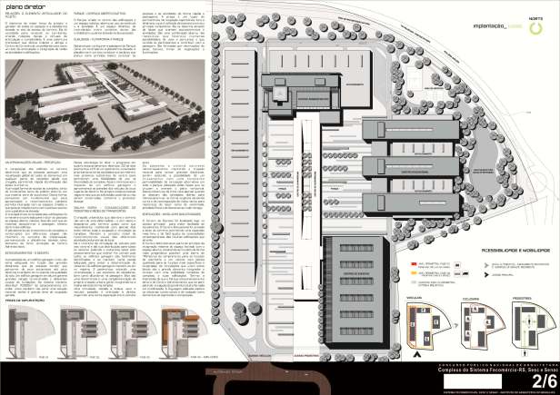 O traçado urbanístico que adentra o terreno nasce e despeja-se pelo terreno quase como que naturalmente, resolvendo com apenas dois anéis viários toda a ocupação e circulação do complexo. É simples porém não óbvia.
