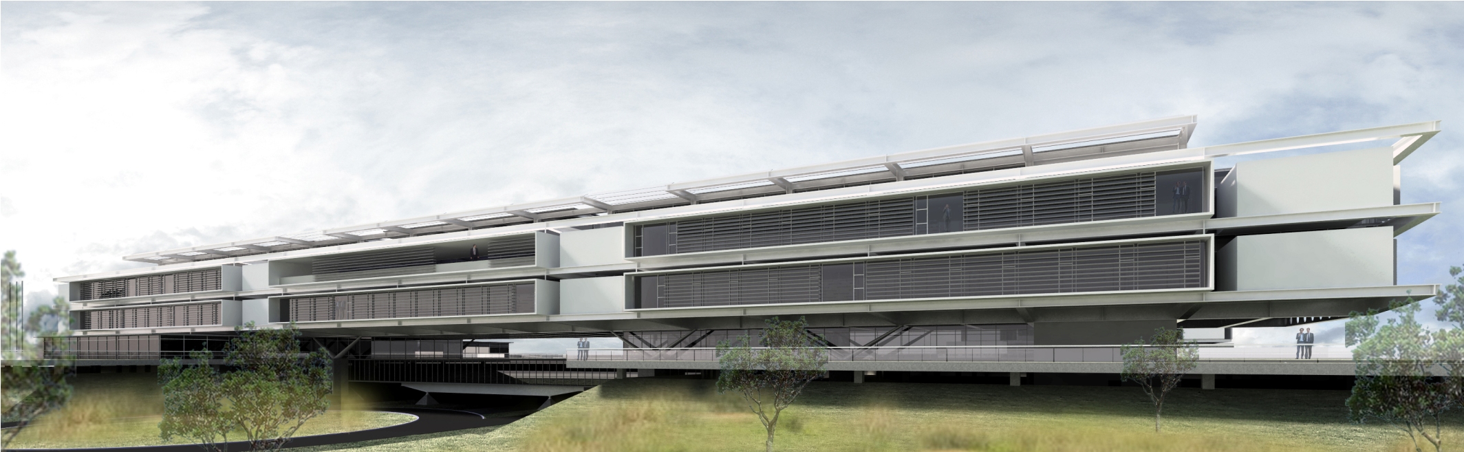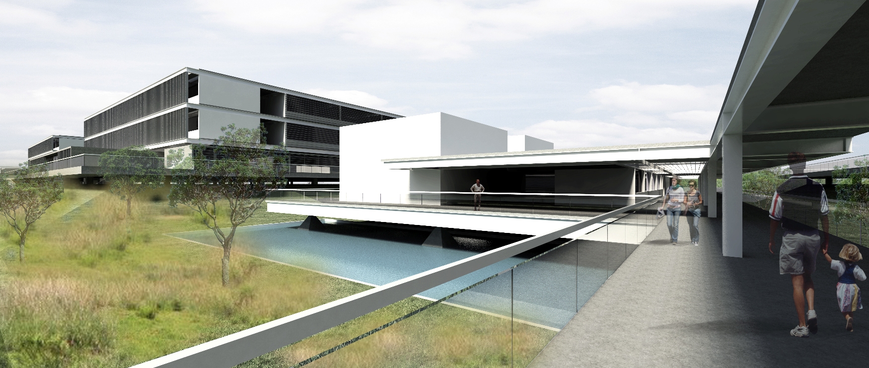 A cidade foi projetada para gerar o mínimo de impacto, tomando como ponto inicial a utilização de quadras para a integração com a cidade mesmo que em uma área mais periférica. A concepção das quadras elevadas em taludes, tem como objetivo servir de dique frente ao terreno alagadiço e ao mesmo tempo abrigar estacionamento protegidos de intemperes com a menor movimentação de terra possível. A terra movimentada proporcionou a criação de um córrego central, usufruindo de tanques de diferentes alturas, tamanhos e plantas para oxigenação do rio, melhorando sua qualidade. Resultando em quadras assimétricos devido a disposição dos tanques, simulando as curvas de um rio, priorizando o ser humano através das conexões por pontes e edifícios-ponte distribuindo o programa junto ao eixo de convivência, aproximando o homem a natureza. As quadras se camuflam frente a sua grande parte de cobertura verde, otimizando o uso e reuso das águas pluviais.