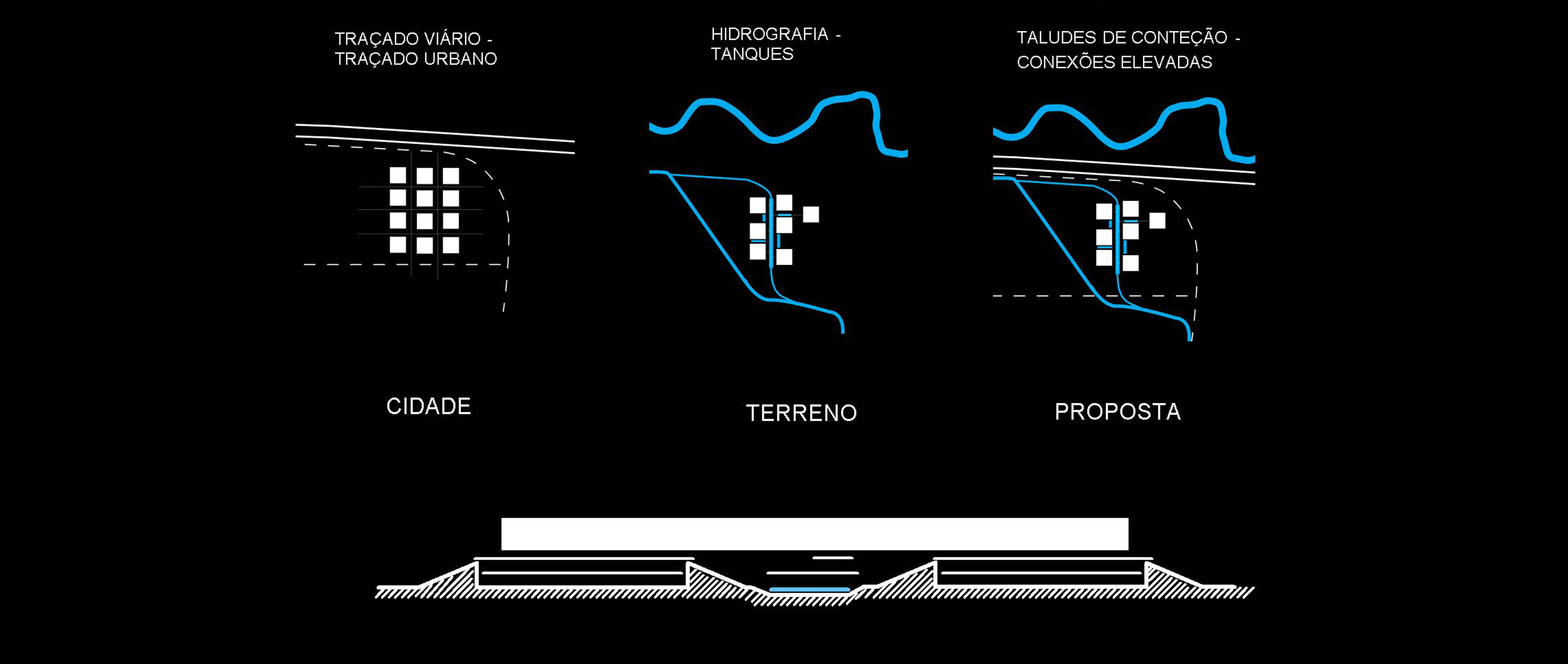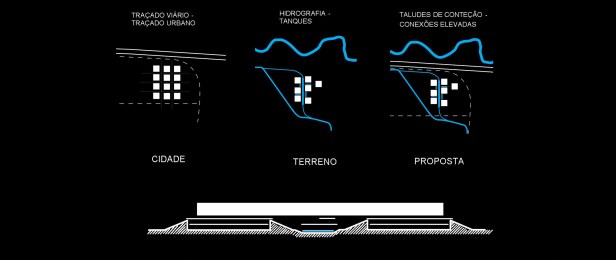 Contexto urbano: localizado em um terreno isolado, em uma área ainda não consolidada e dentro da cidade, vê-se a necessidade de criar um projeto que possua vida própria e possa definir traçado urbano, traçado este aqui organizado em uma via (eixo de circulação e convivência) e suas quadras elevadas.