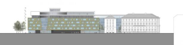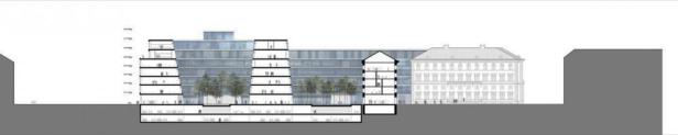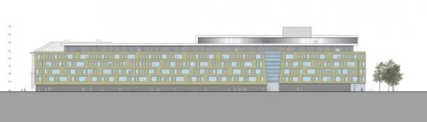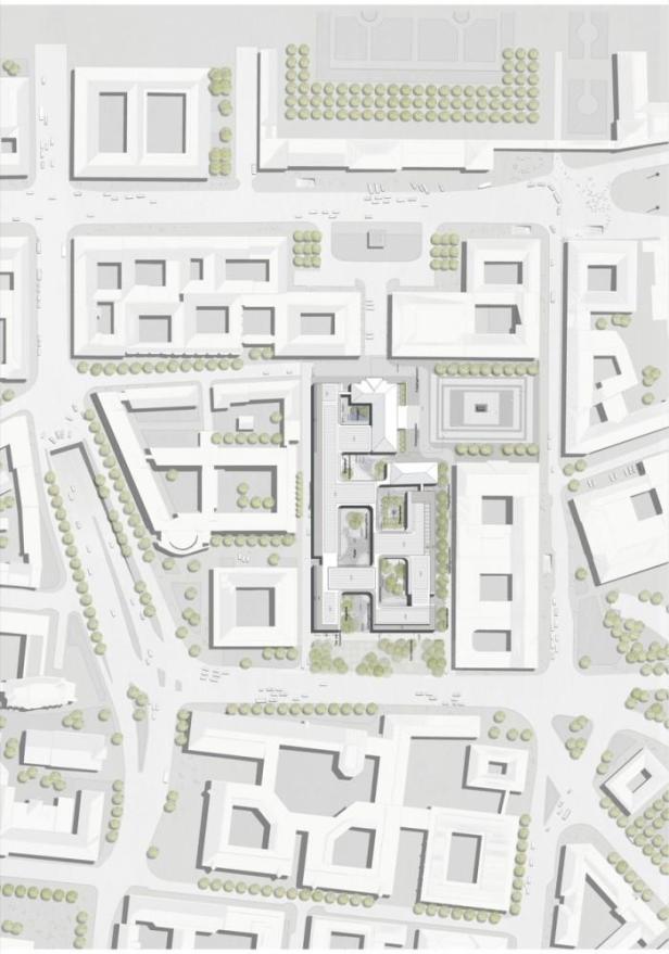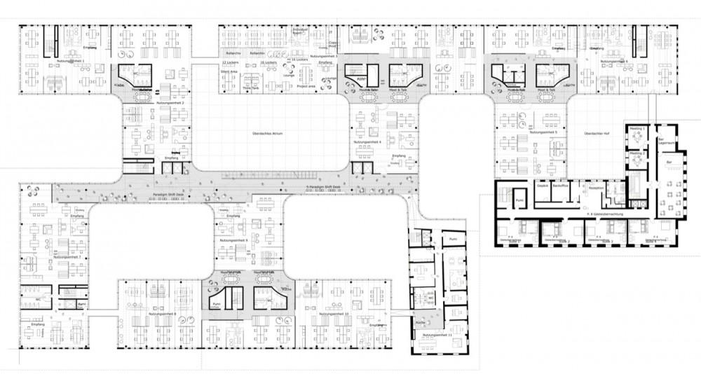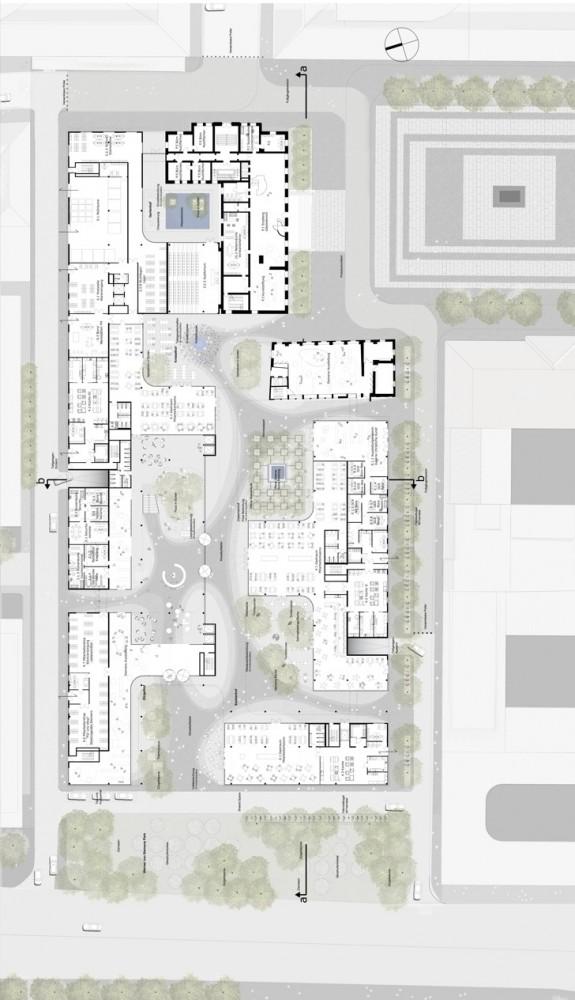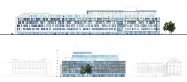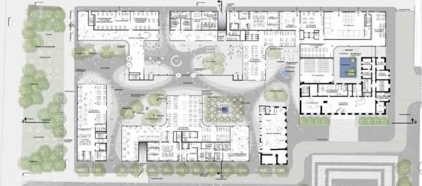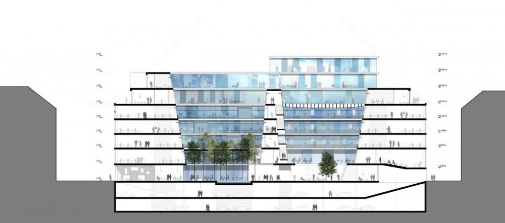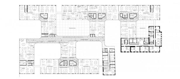 A nova sede é constituída por seis retangulos e por volumes arredondados ligados a uma estrutura central vertical que liga o restante do complexo edificado. Esta estrutura cria seis pátios variados em estreito diálogo com a cidade – gerando assim um novo espaço urbano a ser explorado. Os níveis de escritório estão ligadas por pontes, criando um piso contínuo que se estende através do complexo inteiro. O átrio da nova sede está situado no meio do edifício e é acessível por todos os lados.