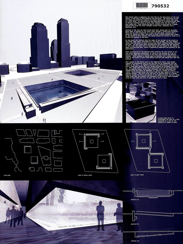 O concurso foi aberto e realizado em duas etapas. Para a primeira etapa, baseada no anonimato, os concorrentes deveriam enviar propostas conceituais em uma única prancha. Ao final da primeira etapa o Júri selecionou oito finalistas que passaram à segunda etapa, durante a qual os finalistas desenvolveram seus conceitos iniciais. O projeto vencedor, anunciado em janeiro de 2004 e intitulado “Reflecting Absence“, é de autoria do arquiteto Michael Arad em conjunto com o paisagista Peter Walker. O memorial – primeira parte do projeto – é inaugurado nesta data – 11 de setembro de 2011 – que marca o décimo aniversário do atentado de 2001. Para mais informações acesse aqui a página do 9/11 Memorial.
