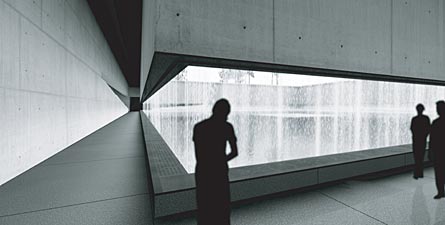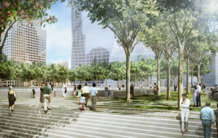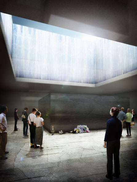 Na descida para o nível abaixo da rua, em direção aos vestígios deixados pelas torres perdidas, descobrimos que a ausência se torna palpável à medida em que se observa e se ouvem as finas camadas de água que caem nos espelhos d’água, cada um com um vazio em sua área central. Podemos ver o céu, agora expressamente delineado pelo perímetro dos vazios, através do véu de cascatas. (…) Se por um lado os vestígios das torres são marcados pelos vazios, a praça circundante inclui um bosque, como afirmaçãoo tradicional de vida e renascimento. As árvores, como a memória em si, demandam o cuidado e atenção daqueles que as visitam e guardam, e lembram a vida em sua forma viva, servindo como representação viva da destruição e da renovação da vida, em seus ciclos anuais. O resultado é um memorial que expressa tanto a incalculável perda de vidas, como o consolo da regeneração. O memorial não apenas cumpre com a missão de preservar os vestígios, de celebrar as vítimas individualmente e de permitir acesso aos alicerces, mas também reconecta o lugar com o tecido urbano da cidade e com a comunidade urbana.”