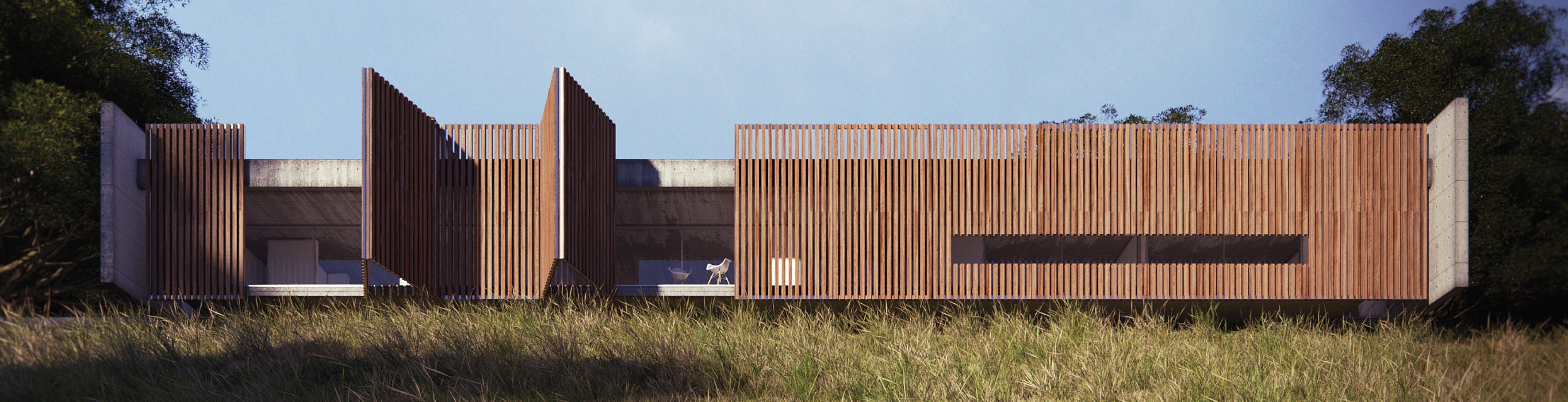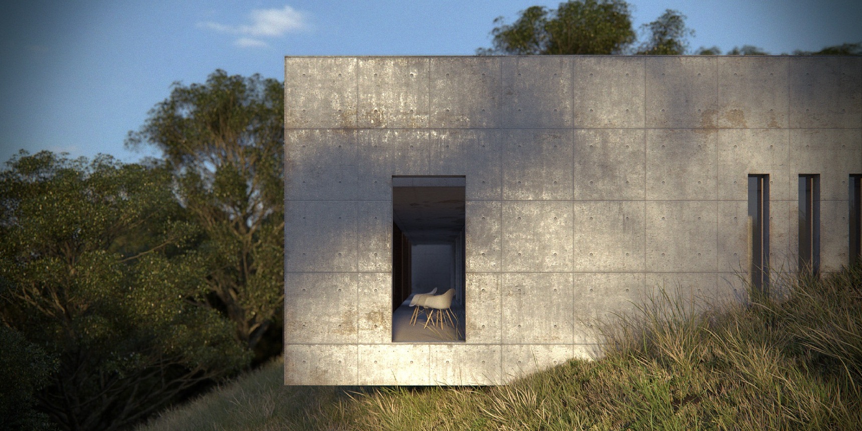 A casa foi pensada para ter implantação discreta, e fazer parte do terreno de forma sutil e delicada. Os materiais, em seu estado natural, reforçam a simplicidade e a relação intrínseca da obra com o local onde está inserida. Concreto aparente e madeira foram as escolhas para a Casa no Vale, com brises que se abrem completamente para o exterior, tornando a varanda, em balanço, o ponto focal do projeto.