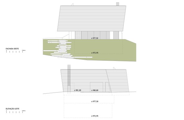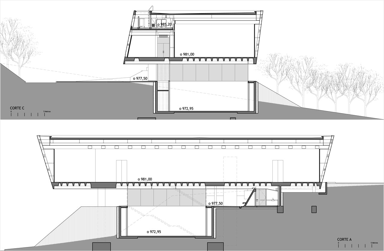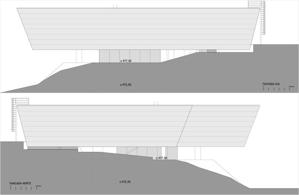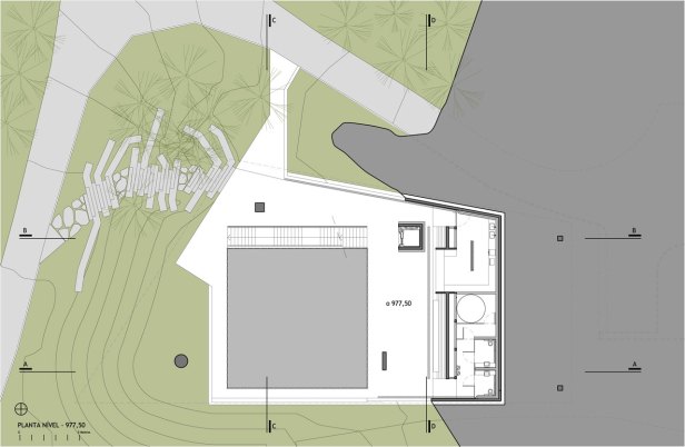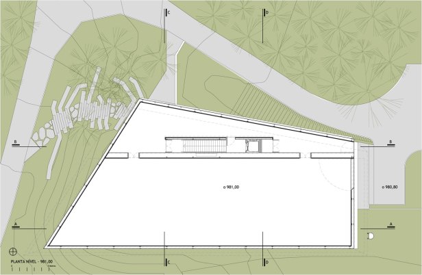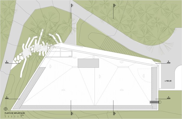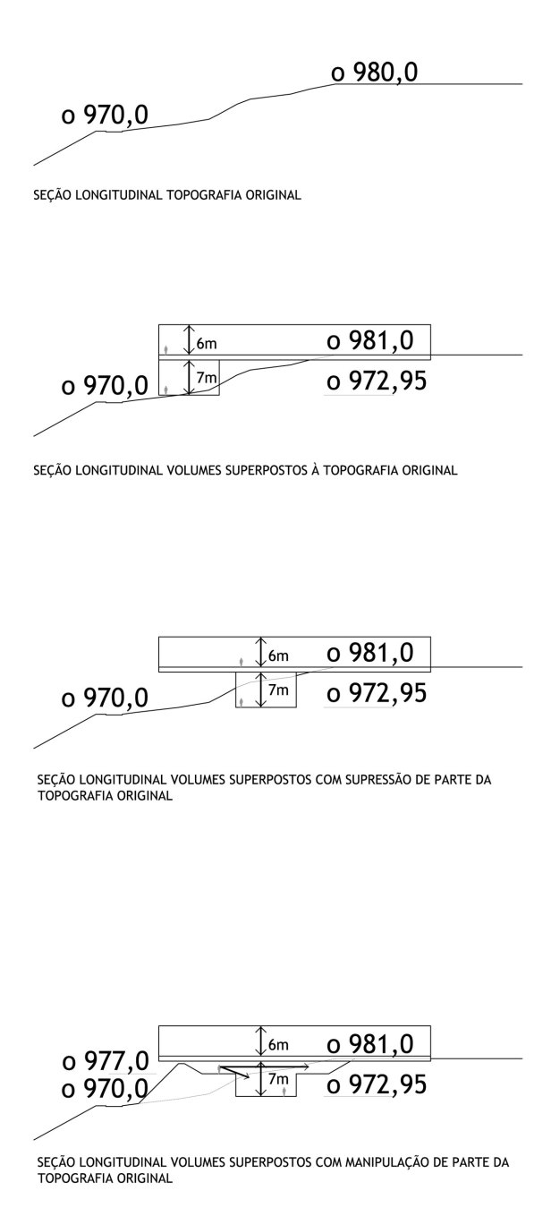 Em resposta à imagem proposta pelo artista, a maior massa construída do edifício se assenta sobre a paisagem como uma pedra esculpida pousada sobre o lugar. Para isso, apenas o volume superior se conforma como volume aparente, e a sala inferior e o pavimento de chegada se definem a partir da intervenção na topografia. Para isso, um volume de aterro existente no terreno foi redesenhado, de maneira a construir uma nova topografia que constitui um dos apoios do volume principal. Enquanto a sala inferior se localiza semi-enterrada, a praça de chegada se conforma como um vazio, intervalo entre chão e construção.