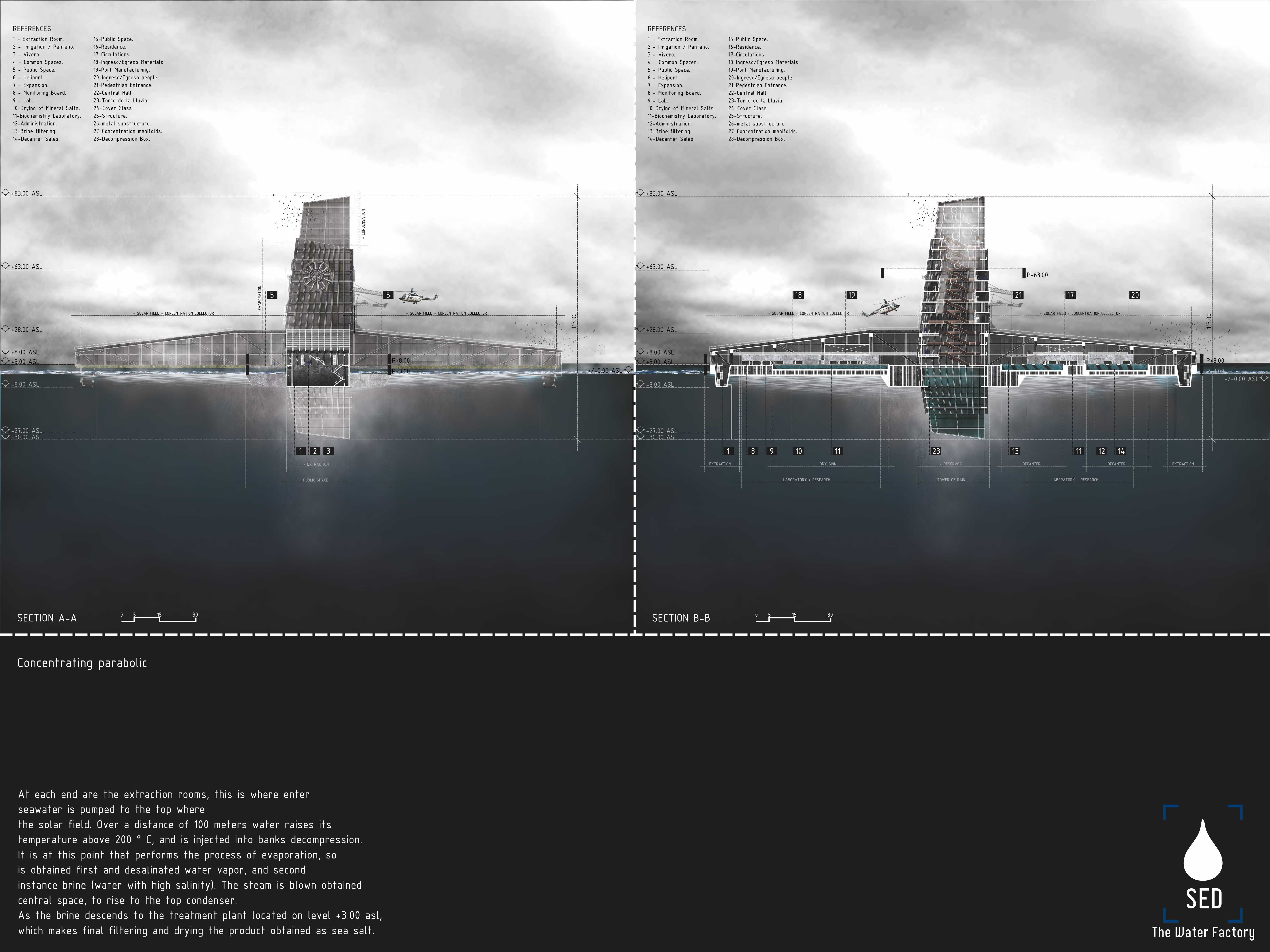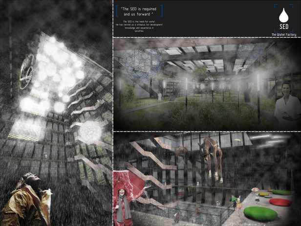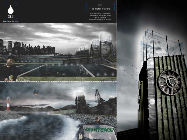 O conceito, SED – Fábrica de Água, responde ao cenário do colapso do sistema global baseado na trajetória de corrente ecológica, econômica e crises sociais. Em seguida, questiona o papel da arquitetura num espaço futuro. Como um tema central, a questão do abastecimento de água é elucidado e o uso ecológico de plantas de dessalinização com base em métodos naturais é explorado. O conceito considera a eficácia de um aplicativo de arquitetura para a sensibilização e educação das comunidades sobre o assunto. O que se propõe são módulos instalados no mar, transportáveis, servindo as cidades ou regiões em crise, em eventos temporários, e, assim, fornecendo infra-estrutura auxiliar.