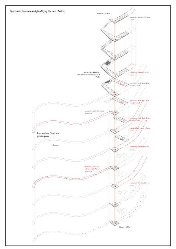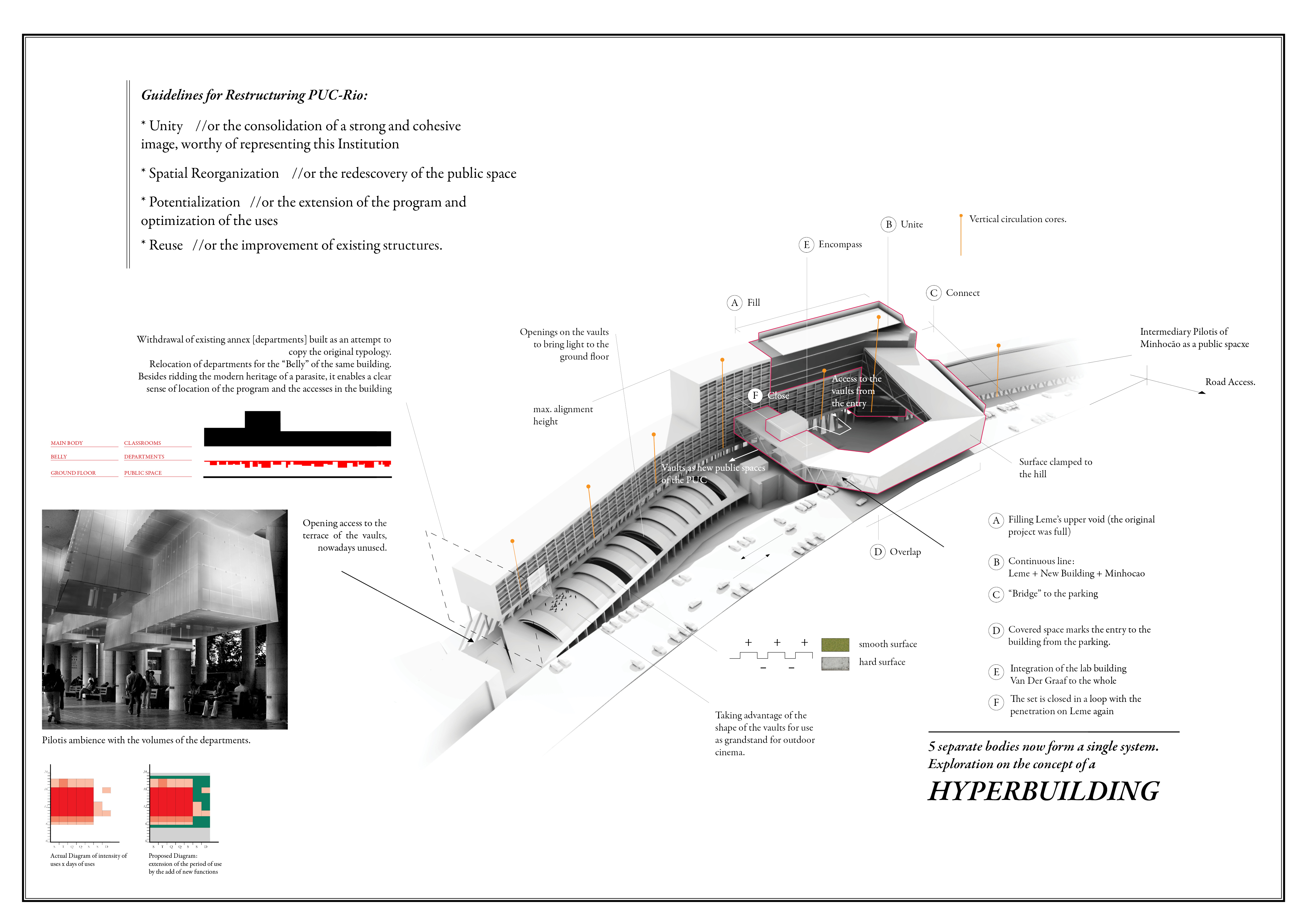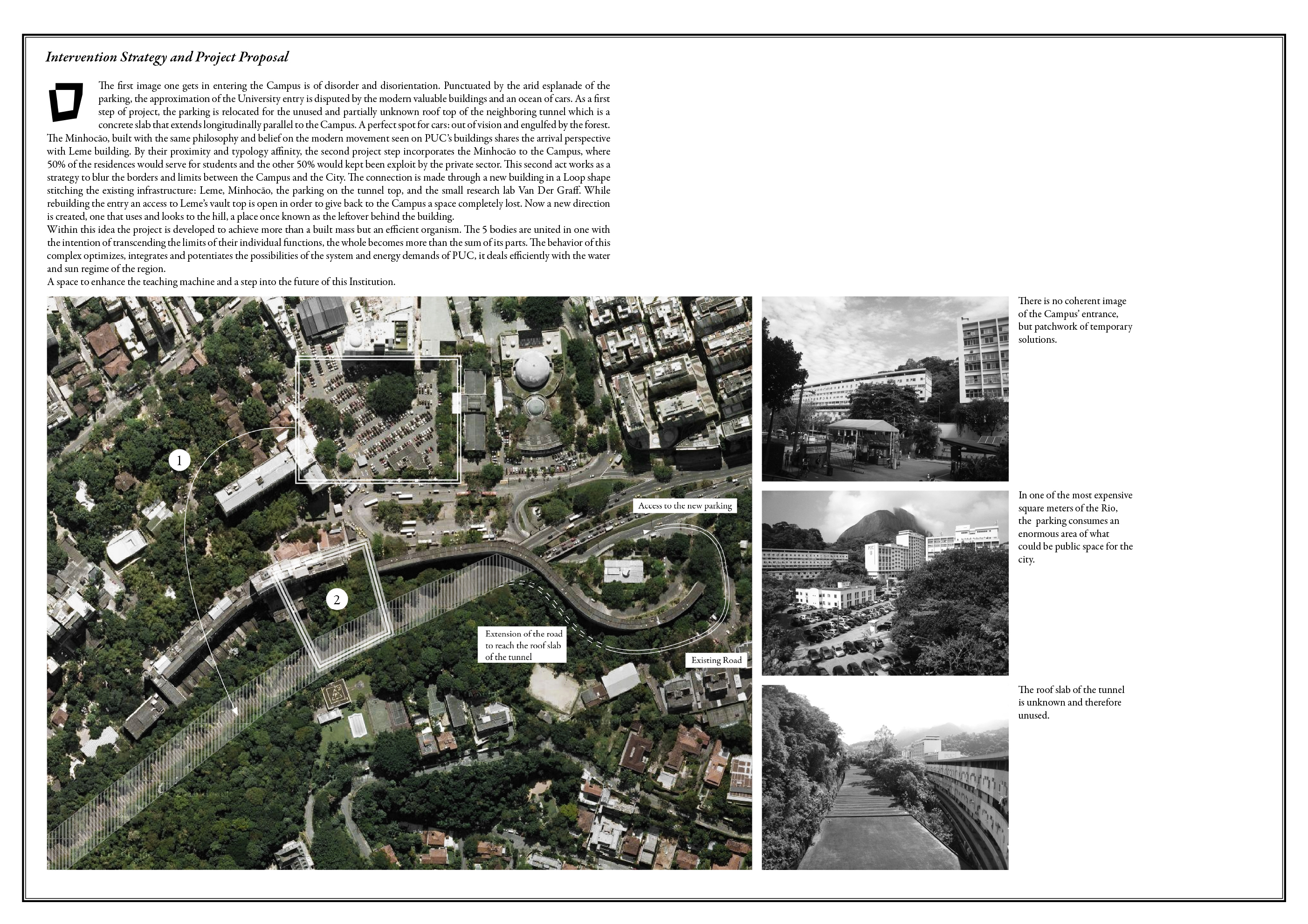 A desordem e a falta de espaço que caracterizam o campus universitário da Pontifícia Universidade Católica (PUC) do Rio de Janeiro deram início ao projeto Infraestrutura de ligação: expandindo a capacidade da universidade. O primeiro componente do projeto é a transferência de uma área de estacionamento que atrapalha o acesso ao campus para uma laje de cobertura não utilizada de um túnel . A segunda e maior intervenção é uma nova estrutura que interliga e expande dois edifícios existentes na mesma área localizada na entrada do campus. Essa estrutura de vários andares terá também um valor simbólico, demonstrando a união através da interligação das duas principais estruturas existentes e da nova instalação de estacionamento.