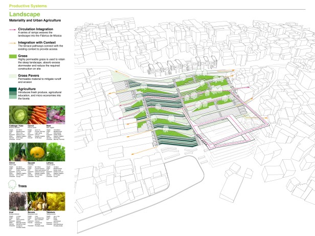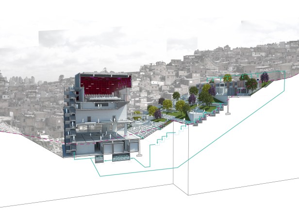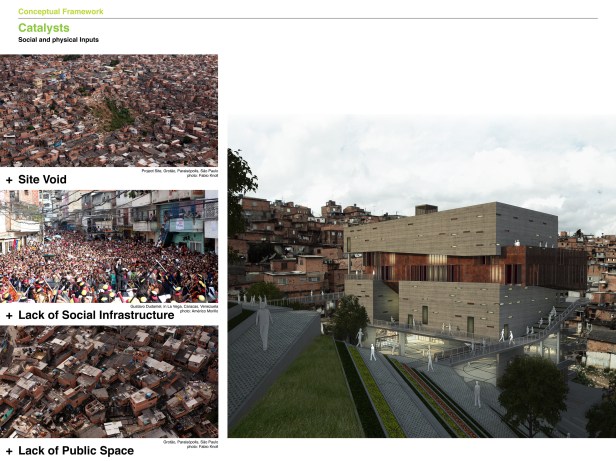 Este projeto para um edifício público multifuncional, intitulado Grotão – Fábrica de Música, está localizado no Grotão, no coração da favela de Paraisópolis, em São Paulo. Com mais de 100.000 habitantes, essa é um dos maiores assentamentos informais do mundo. Assim como várias outras favelas, e apesar da sua localização excepcionalmente central, esta área está efetivamente separada do centro formal da cidade e de toda a sua infraestrutura social e cultural. Além disso, devido ao desenvolvimento informal e às condições topográficas e geológicas da área, este local é caracterizado pela ocorrência crescente de erosões e de perigosos deslizamentos de lama. O projeto assume esses dois desafios principais dependendo de uma intensa participação comunitária para o seu desenvolvimento. A topografia, neste projeto, é mantida e estabilizada com o objetivo de prevenir futuras erosões, criando uma arena natural em um espaço público com terraço e incluindo uma área reservada para agricultura urbana. Diversas características de baixa tecnologia são propostas. Será introduzido um sistema de gerenciamento de água que permite a utilização de água de chuva no local e o reaproveitamento de água cinzenta. Um sistema integrado para o uso ativo e passivo da ventilação, do resfriamento e do ar condicionado vai ser aproveitado tanto na construção do edifício como na do anfiteatro. Na sua estrutura vertical, o prédio oferecerá diversos espaços para escolas de música, incluindo uma pequena sala de concertos, além de instalações esportivas, espaços públicos e infraestruturas de transporte.