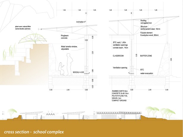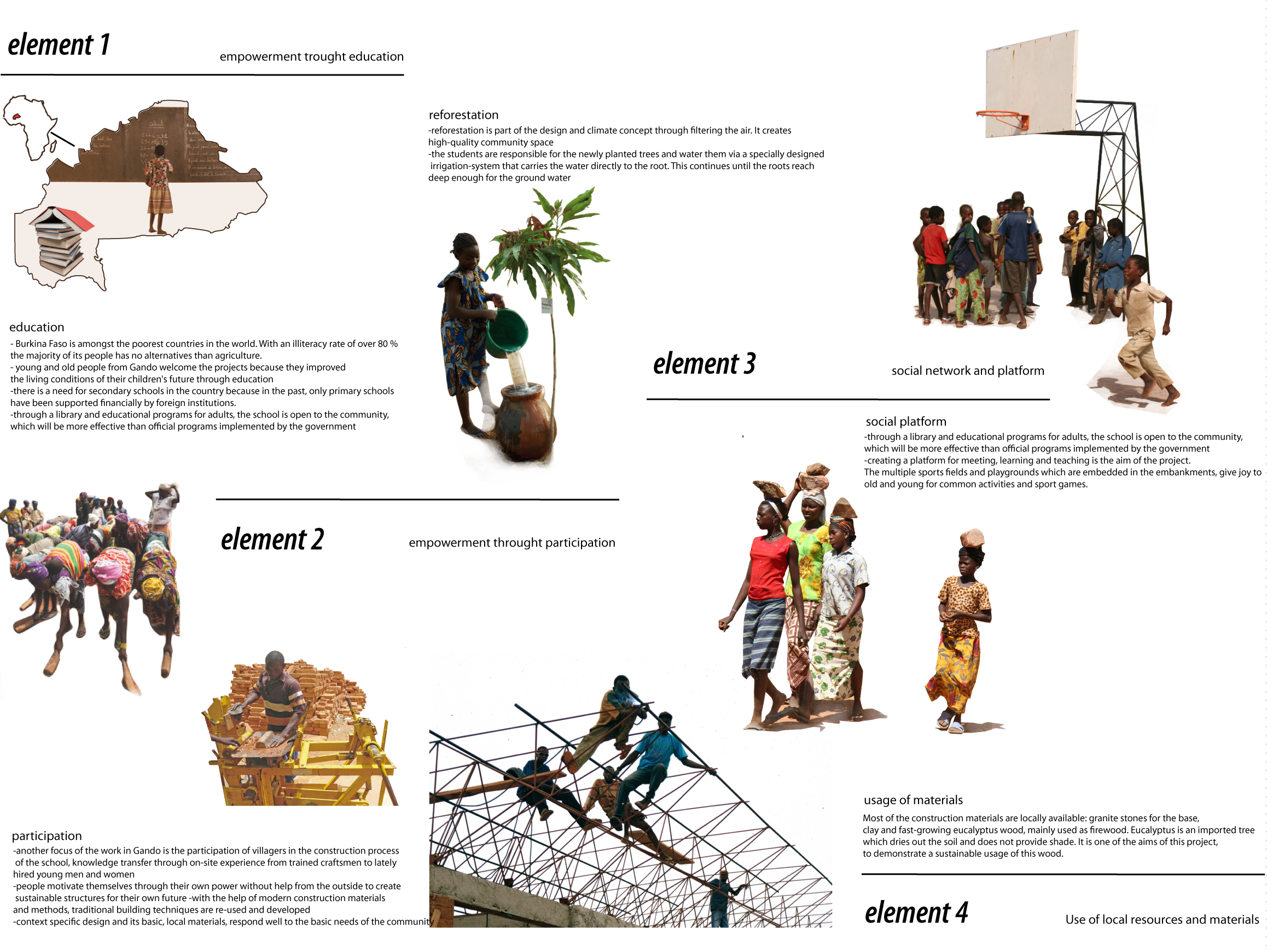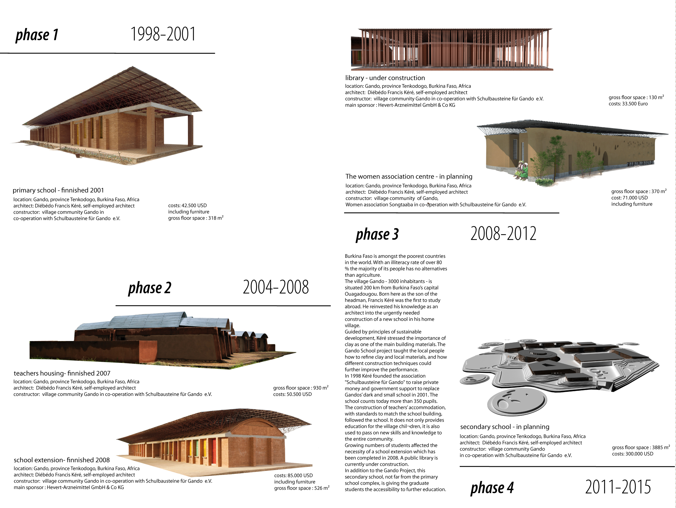 O projeto está situado num dos países mais pobres do mundo e de difícil acesso à educação, principalmente em zonas rurais. Gando, uma região com 3.000 habitantes, não dispunha de infraestrutura para escolas de 2°grau. O projeto desenvolvido considerou os condicionantes climáticos, numa região onde no verão as temperaturas atingem 35°C. A equipe de arquitetos vencedores utilizou como solução ao desafio de diminuir as elevadas temperaturas um sistema de ventilação natural, um sistema de tubulação subterrânea, vegetação e um sistema de dupla cobertura do telhado e nas fachadas. Utilizando-se destes mecanismos produziram uma redução térmica de 5°C, tornando a escola um lugar com melhores condições de conforto térmico.