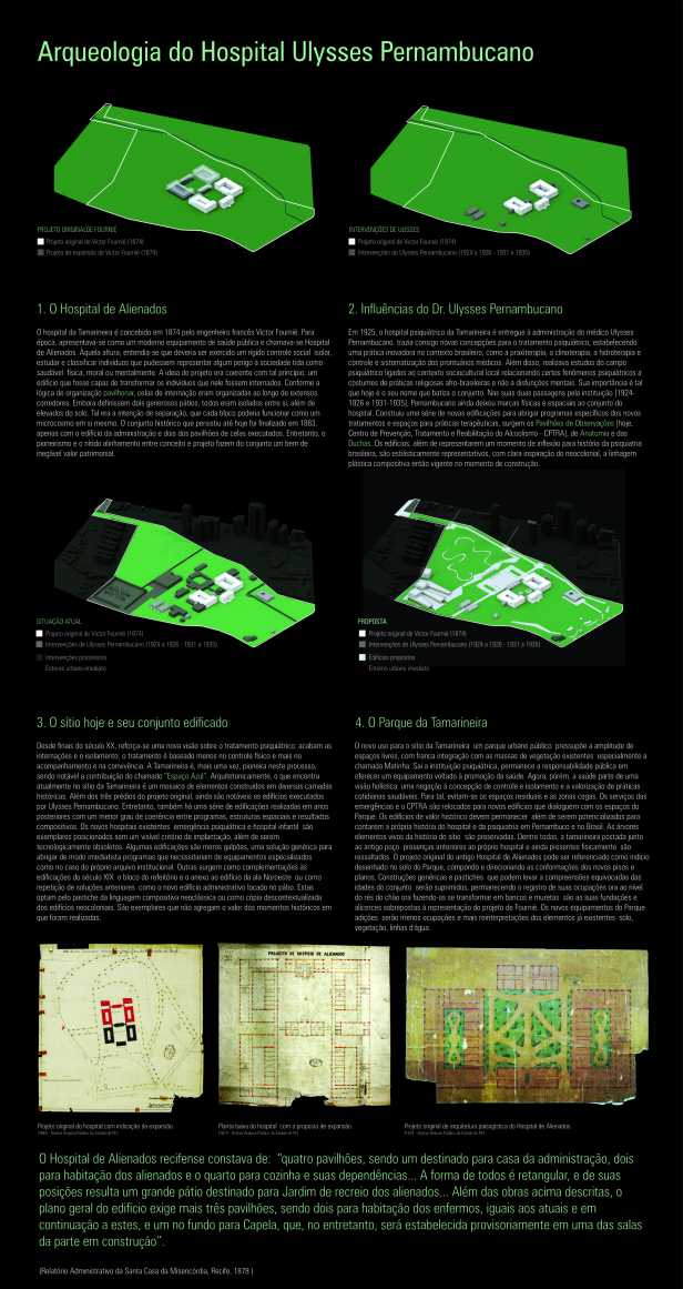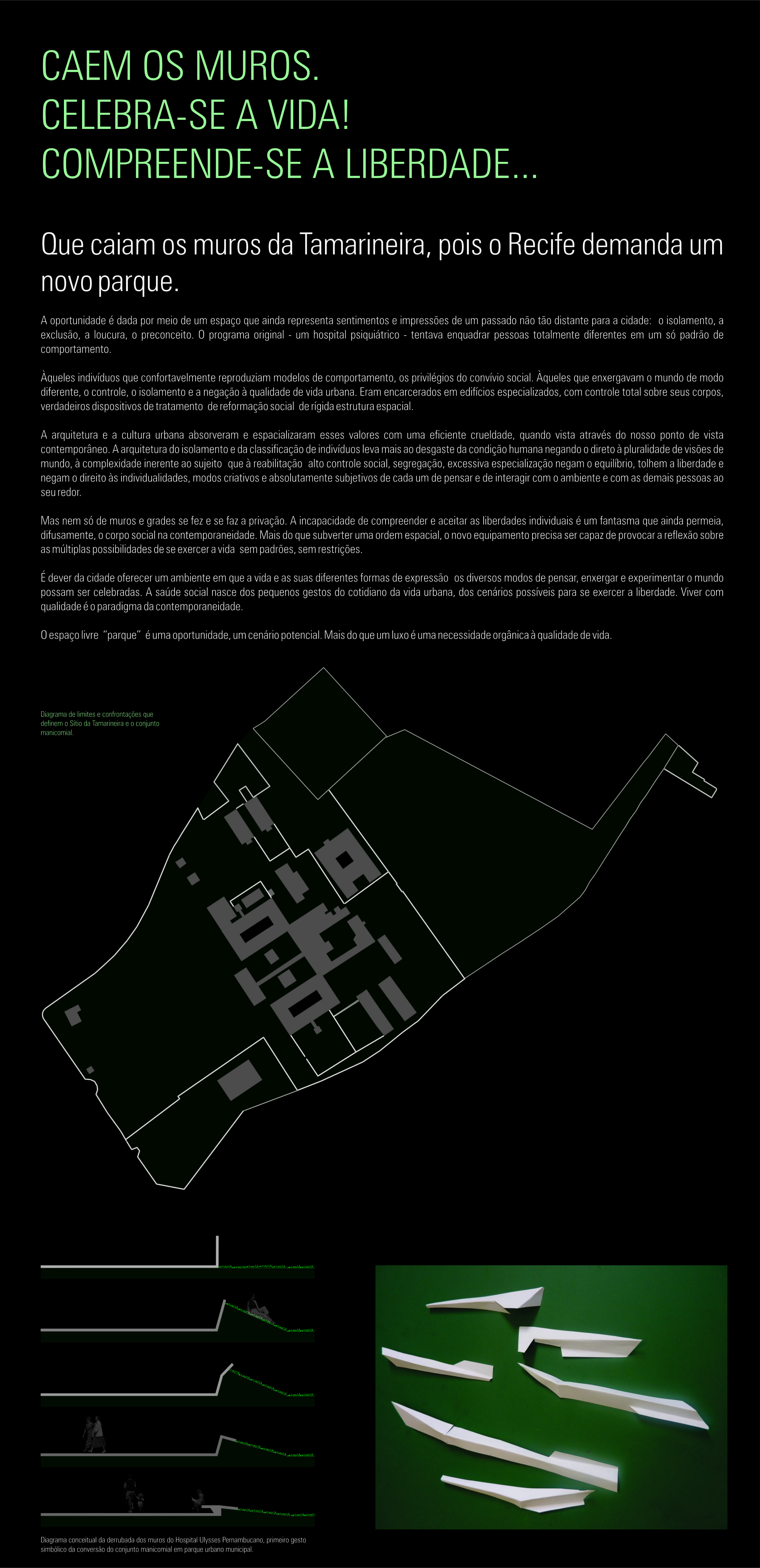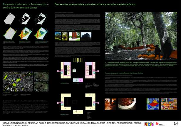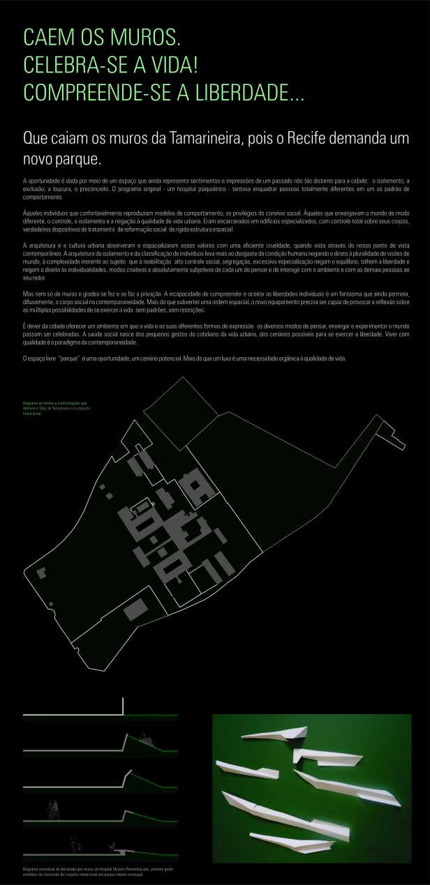 Além do mais, propõe-se o entendimento do Parque não só como lugar de contemplação ou da prática de atividades físicas. O Parque da Tamarineira deve comunicar como um museu, mas sem a necessidade da exposição de um acervo material. Definindo um trajeto interpretativo do imaginário, através do edifício histórico, apresenta-se uma série de experiências arquitetônicas que permitam ao visitante refletir simplesmente por caminhar no espaço público – um pátio para as memórias, uma esplanada para as visões de futuro, um passeio sinuoso e reflexivo em meio à Matinha.